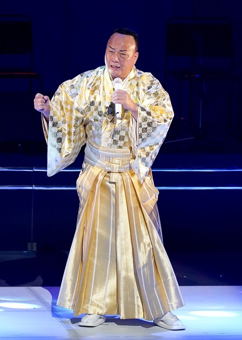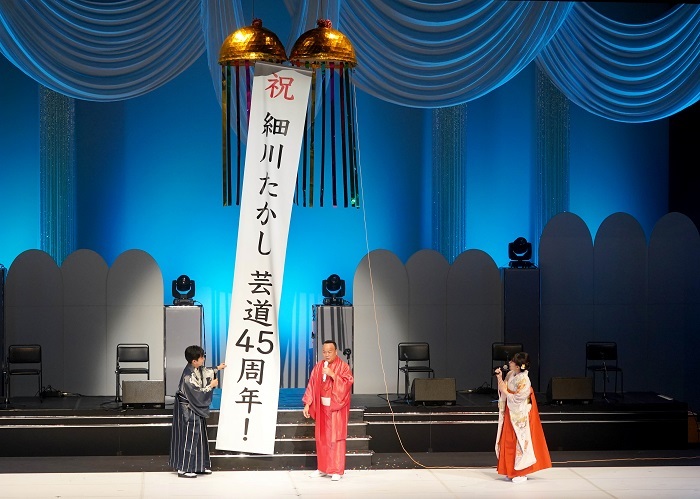 会場は、ソーシャルディスタンスを考慮して座席数を半分にし、650人の熱烈なファンが詰めかける中、細川、杜、彩青の3人で、細川の大ヒット曲「浪花節だよ人生は」を歌った後、スタッフたちから贈られたくす玉を割ると、中から「祝 細川たかし 芸道45周年!」と記された長尺の垂れ幕が現れ、大感激。