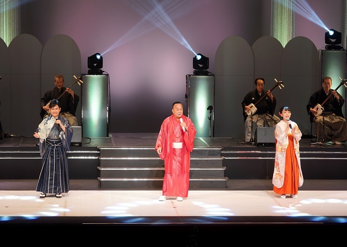 そんな盛大なオープニングの幕を開けた後、細川が「北酒場」「心のこり」「矢切の渡し」、杜が、2013年5月22日発売のデビュー曲「三味線わたり鳥」や9枚目の最新シングル「郷愁おけさ」、彩青が、昨年6月26日発売のデビュー曲「銀次郎 旅がらす」と第2弾の新曲「津軽三味線ひとり旅」などを披露。
