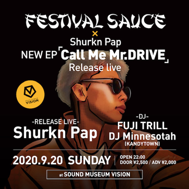 9月20日(日)にSOUND MUSEUM VISIONにて、『FESTIVAL SAUCE × Shurkn Pap 「Call Me Mr.DRIVE」RELEASE LIVE』が開催されることが発表された。
