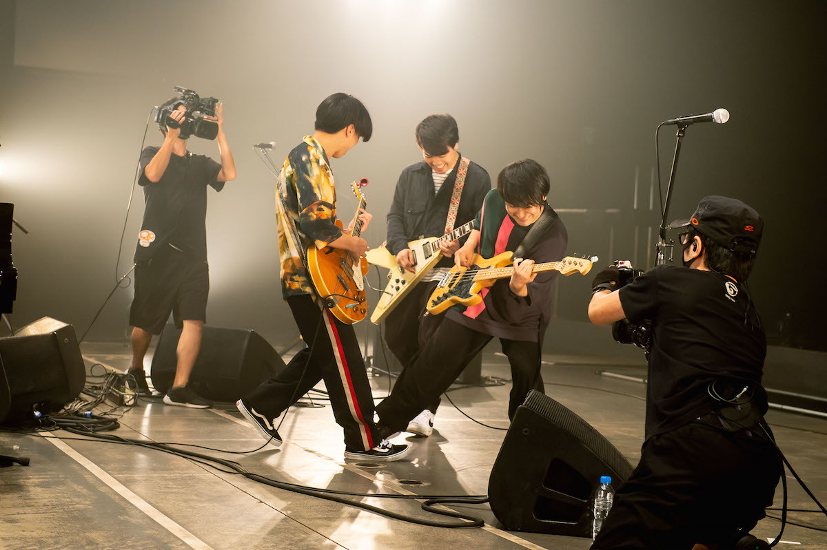 ステージ上は、上手から順に田辺由明(Gt/Cho)、はっとり)、長谷川大喜(Key/Cho)、高野賢也(Ba/Cho)が横一列に並び、4人の後ろにサポートメンバーの高浦“suzzy”充孝(Dr)がいるフォーメーション。9月頭に出演していたオンラインフェスで「ライブでやるのが初めて」と言っていた、つまりライブでやるのはこの日で2回目の「遠心」。このバンドのことは信じても大丈夫だぞと繰り返し唄う、捻くれ自己紹介ソング「トリコになれ」。そして「girl my friend」の疾走感で以って、バンドの音がみるみる解き放たれていく。長谷川が鍵盤を弾いていないときにエアベース的なしぐさをしてノリノリになっていたり、5人がアイコンタクトをとっていたりと、ステージ上の楽しげな様子も頻繁に映る(特にドラムの左側に設置されているカメラがいい仕事をしている)。「girl my friend」のアウトロでは、はっとりと田辺が向き合ってギターを鳴らし、曲を締めた。