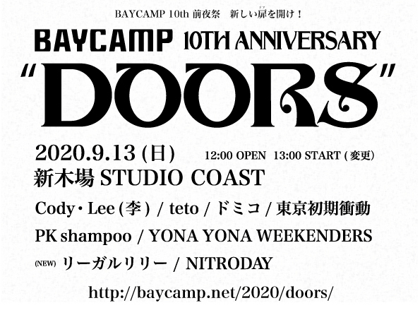 オールナイトロックイベント『BAYCAMP』10周年の前夜祭として、9月13日(日) に新木場STUDIO COASTにて開催される『BAYCAMP 10th anniversary “DOORS”』の出演アーティスト第2弾が発表された。