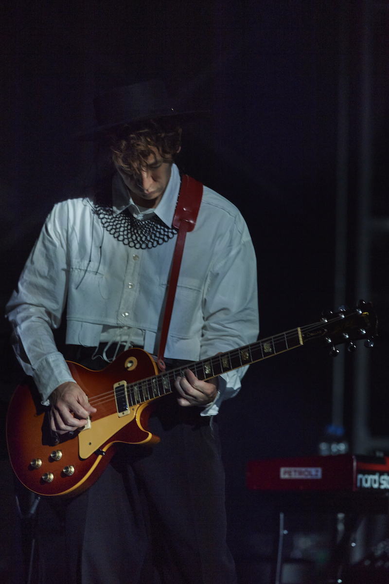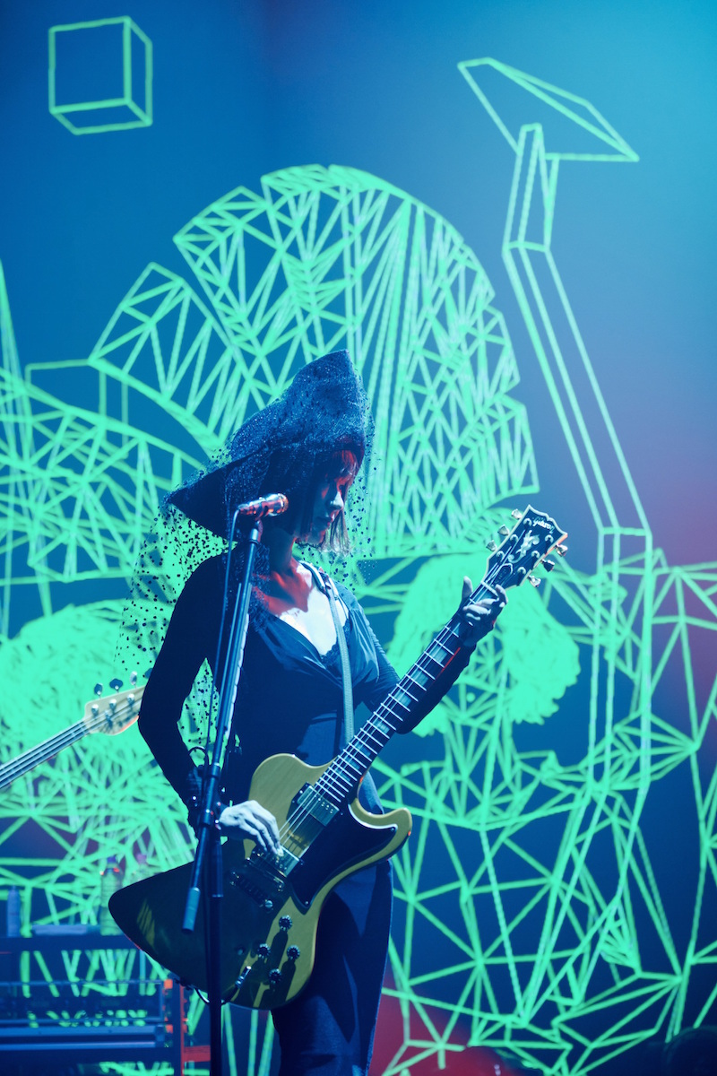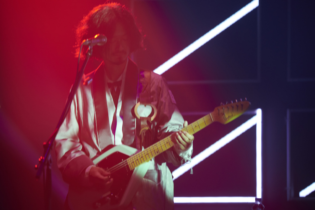 ステージセットは「永遠の不在証明」のLEDパネル。メンバーの出で立ちは、それぞれ色違いの打ち掛けに、白のエリザベスカラー(天草四郎時貞とかがしているあれです)。椎名の背中には、大きく広がった白い羽根。右手には黄色の小旗を持ち、トラメガに勢いよく声を放り込んでいく。この曲も、次の「群青日和」も、伊澤一葉はギター。1曲目の途中でギターを携えた椎名林檎、曲後半で小旗を放ってそれを弾き始め、そのままの流れで「群青日和」につながっていく。トリプル・ギターのせいか、各々のプレイによるものなのか、オリジナルの「群青日和」よりも、格段にラウドで荒々しい。曲のアウトロでは、刄田綴色を除く4人がフロントに出て、横一列でギター&ベースをかき鳴らす。
