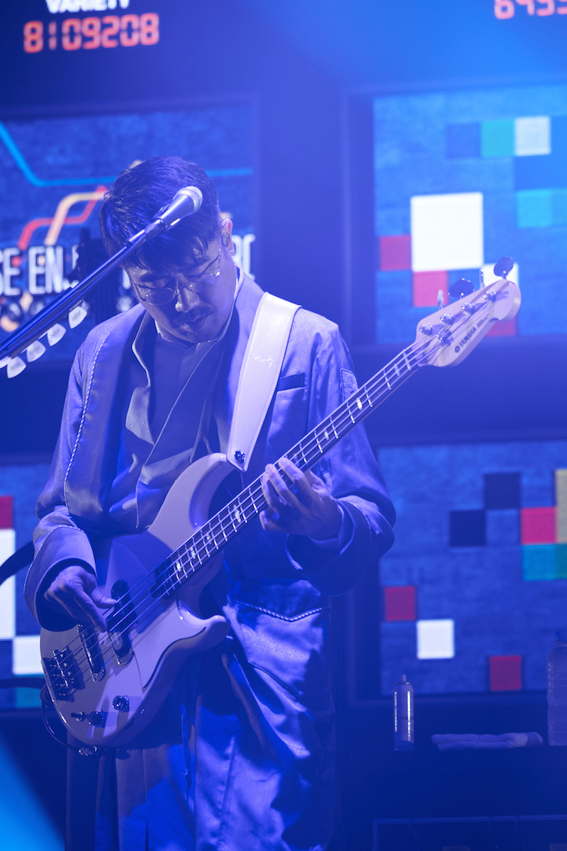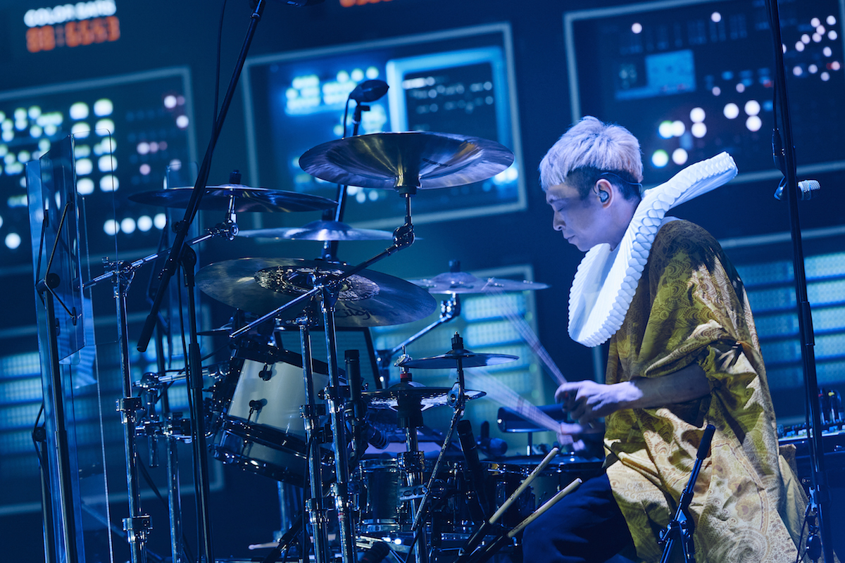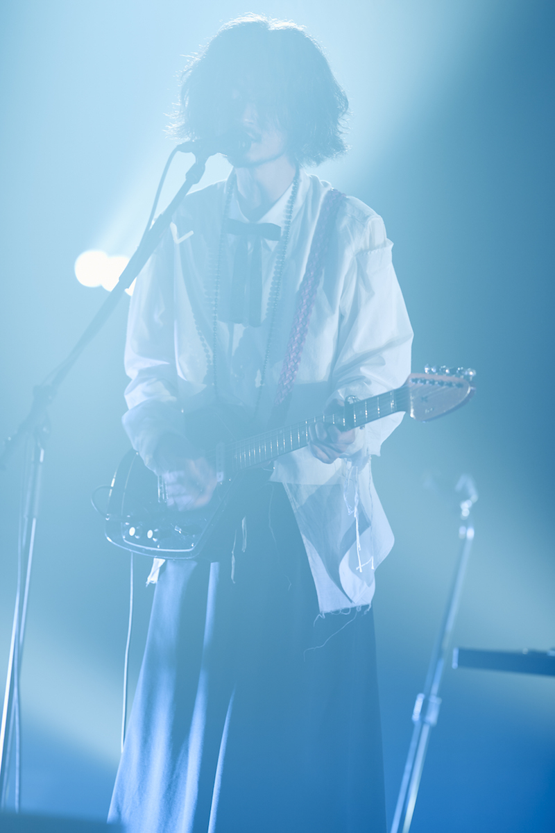 伊澤のピアノと椎名の歌だけでしばし聴かせてからバンド・サウンドがなだれこんでくる「スーパースター」では、曲が進むにつれ、ギターもベースも鍵盤もドラムも、どんどん音がカオスになっていく。アウトロで、腕がもげそうな勢いでドラムを叩く刄田に目をやった椎名、ちょっと微笑んでいるように見えた。浮雲・伊澤・亀田は白シャツ、刄田は指揮者みたいな黒い燕尾服になっての「乗り気」の間奏では、ショルキーの伊澤を含む3人がフロントで演奏、椎名はその横で手旗を振る。次の「閃光少女」では伊澤はギター、アウトロでソロを弾きまくる。亀田と刄田は笑顔で視線を送り合い、椎名は遠くを見ながらマイクに声を送り込む。ステージが明るくなったり闇に落ちたりの緩急が激しい「キラーチューン」では、空の客席をカメラが左右へ走る画など、引きのショットが多く混じり始める。ステージを右へ左へと動きながら、朗々と声を響かせ続けた椎名は、曲終わりでバレリーナのような美しいフォルムのお辞儀をしてみせた。