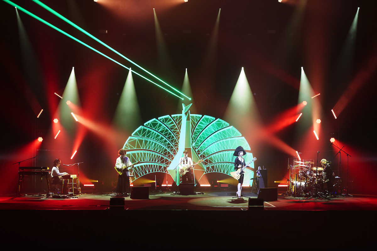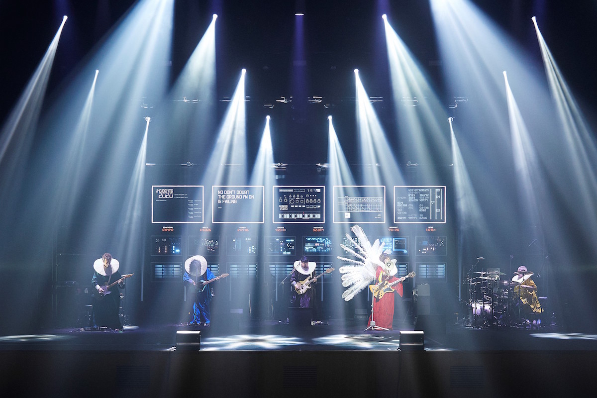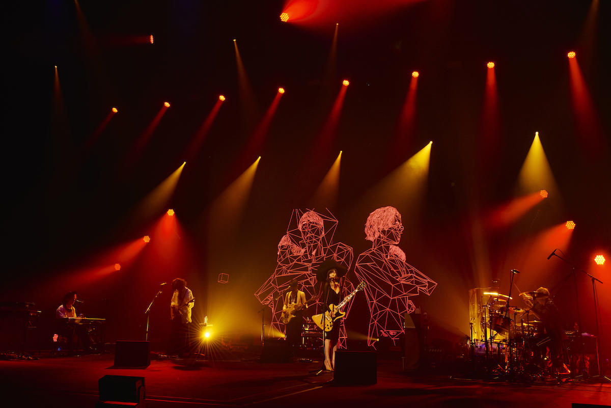 椎名のボーカルとぶつかって溶け合うような浮雲&伊澤のギターも、それらを空に解き放つように響く亀田&刃田のリズムも、すごいスケール感。「今なら僕らが世界一幸せに違いない あぶない橋ならなおさらわたりたい 神様お願いです、終わらせないで」というこの曲、このライブの最後を飾る存在として、これ以上のセレクトはなかった、と、観ながらつくづく思う。曲のアウトロで、まずメンバー5人の、続いてこのライブに関わったスタッフのクレジットが、エンドロールとして流れた。音が止まってもクレジットはしばし流れ続けたが、その途中でうっすらと明るくなったステージに、すでに5人の姿はなかった。