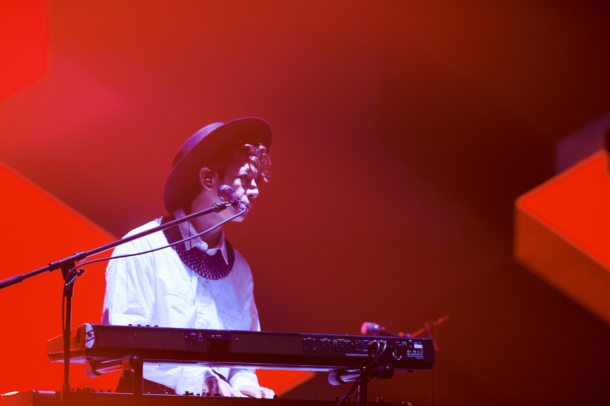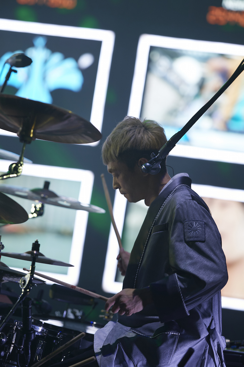 ノンストップで「FOUL」。おそらく、この日BPM最速。バンドの音と歌はひたすらラウドに昇りつめ、ステージからレーザーが飛び、LEDには走ったり飛んだり闘ったり飛び込んだりする人々のグラフィックが、目まぐるしく映し出される。メンバー5人と同じようにそこにいる、そこにある、そんな錯覚をしそうなほど立体的なグラフィックを背にしての「勝ち戦」(英詞なので字幕あり)、椎名の歌と伊澤のピアノがサビで競い合う「透明人間」を経ての、ラストの曲は「空が鳴っている」。