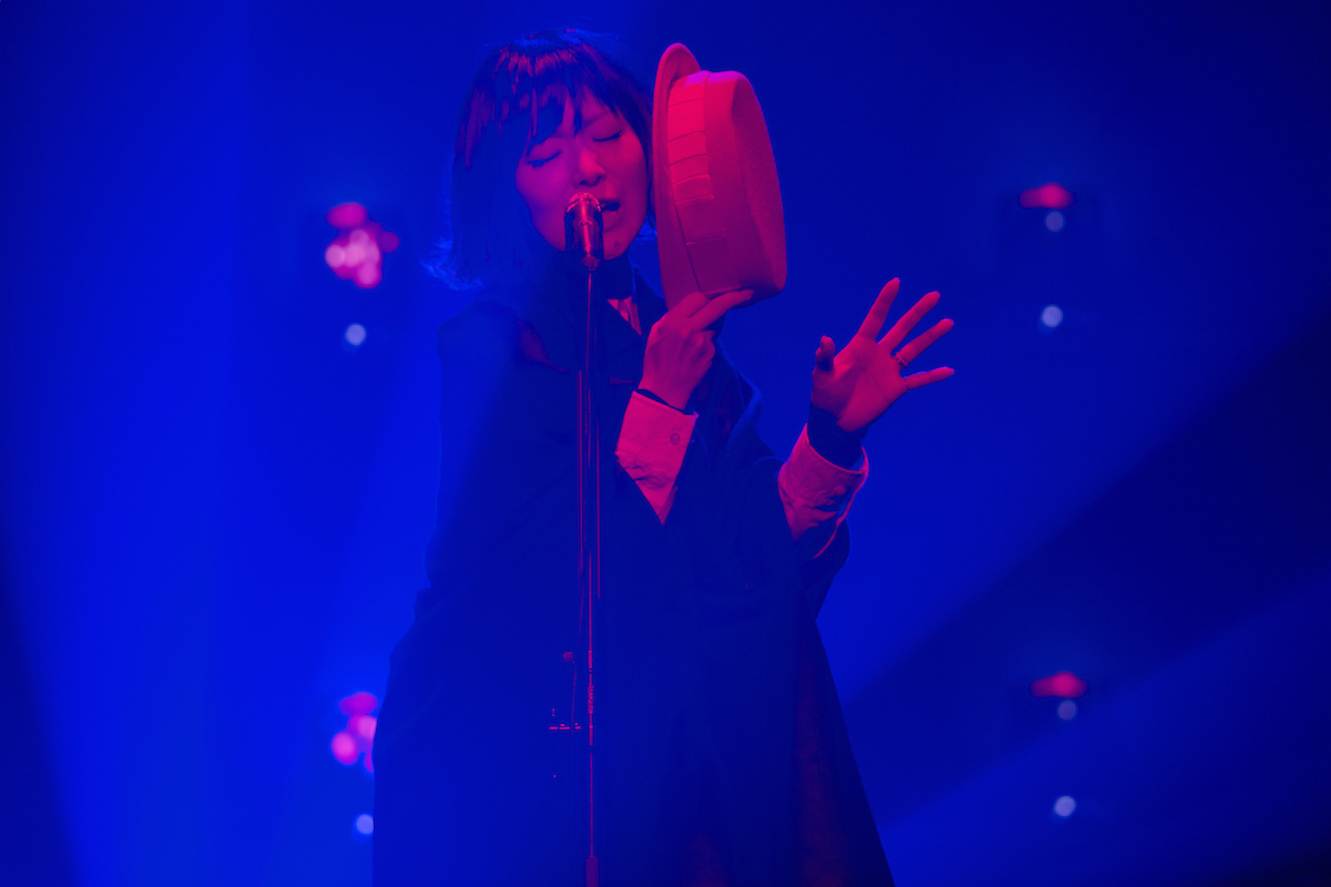 というロボット声のナレーションを経て、ステージに灯りが戻ると、全員白いシャツに錫色のガウン姿に変わっている。そして浮雲→伊澤→椎名と歌がリレーしていく「某都民」へ。ここから椎名林檎は、おなじみの、身体は向かって右を向き、顔は正面を向いて歌うフォーメーションになり、伊澤一葉はキーボードへ移る。曲間なしで、というより、まるで同じ曲の続きのように入った「選ばれざる国民」では、ミラーボールが回り、後方のLEDは、多数のテレビモニターのように、さまざまな映像を映し出す。浮雲と椎名と伊澤、3人の声が2対1の掛け合いになったり、中盤で3人が揃ってユニゾンと化したり、後半でまた掛け合いに戻ったりするさまが圧巻。