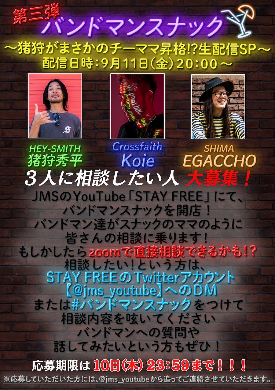 JMS YouTubeチャンネルによる番組『STAY FREE』の人気企画「バンドマンスナック」が番組初の生配信で行われることが決定した。