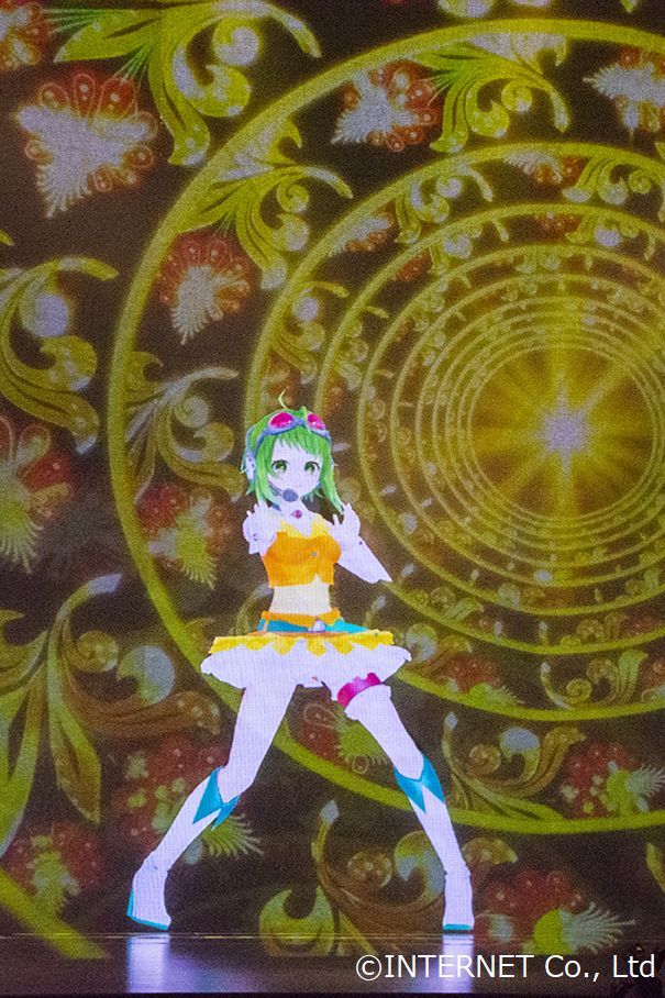 ここでステージに呼んだバーチャルゲストの音街ウナが登場する。ウナとファンから愛にあふれたおめでとうコールを受け取り「ウナちゃん、みんな、本当にありがとう!」と感謝したGUMIは、ふたりが並び相対的に踊った「再演(音街ウナ・GUMI)」から、歌の主役をウナへとバトンタッチ。ユーロビートを彷彿とさせる「はやくそれになりたい!」「カンデンさせちゃうぞ」をパワフルに歌いきったウナと引き換えに突如、神威がくぽが中毒性の高い「ダンシング☆サムライ」で降臨するも、一言も残さず姿を消したことに、GUMIは感嘆の声を上げた。
