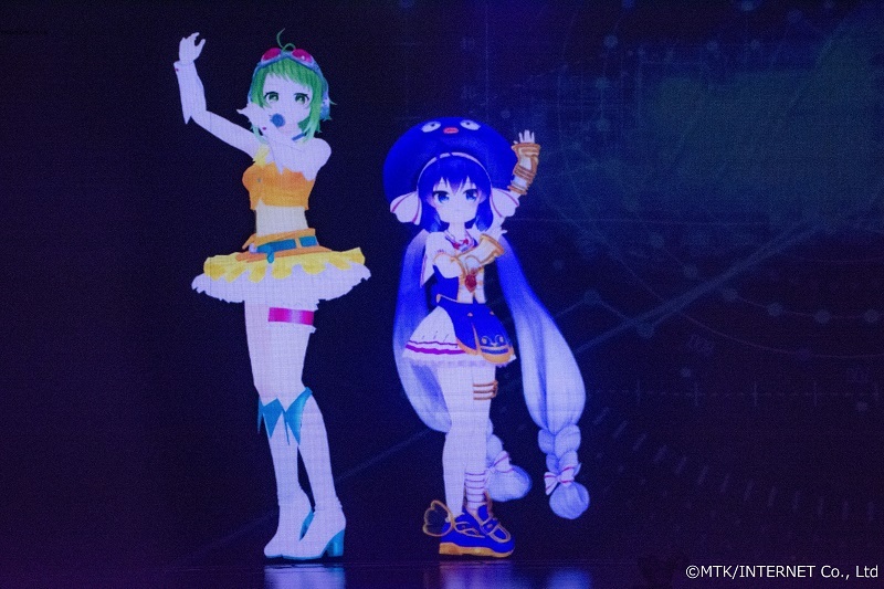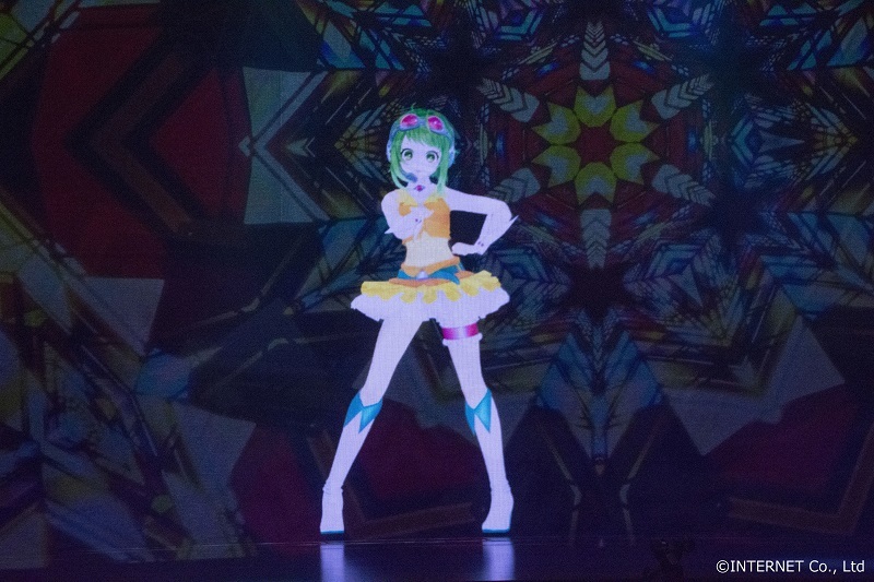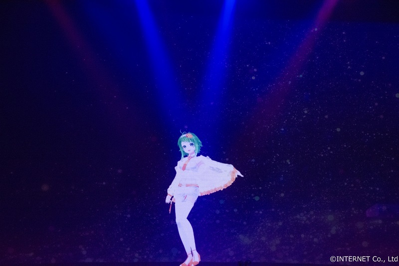 1曲目のイントロが流れてから、スポットライトの下、普段のミニスカコスチュームに身を包んだGUMIが、顔に両手をかざし目を瞑ったままの立ち姿で、うっすらと現れた。ライブは、GUMIによるジャンプを合図に、現実へとダイブするポップチューン「セツナトリップ」からスタート。いくつものカラフルな星が円状になりくるくると回転していく。この日は、ステージ手前の中央に設置された透過スクリーンが、画面越しでライブを視聴するファンから見たGUMIを立体的に映す役割を果たしていた。配信ライブとはいえ、まるでキャラクターが目の前に居るかのような臨場感をもたらすことができるのは、バーチャルならでは。