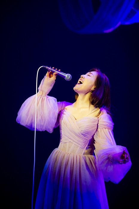 約20分の休憩/換気ののち、2部がスタート。1曲目は映画『グレイテスト・ショーマン』のオリジナル・サウンドトラックから「NEVER ENOUGH」だ。それはまるで、新型コロナウイルスによる膠着状態を打ち破るべくの決意表明ともとれる、力のみなぎる圧倒的な歌だった。「おひさま〜⼤切なあなたへ」「Reset」は、それらの歌がそもそも備えている強さを、この時代感がより際立たせることとなった。