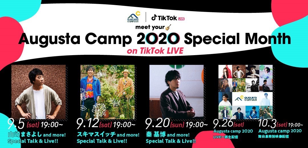 オフィスオーガスタとTikTokによるタイアップ企画『「Augusta Camp 2020 Special Month on TikTok LIVE」~1ヶ月まるまる、オーガスタキャンプを楽しもう!~』の企画として、9月26日(土)に開催される『Augusta Camp 2020』初日フィナーレをTikTok LIVEで配信することが決定した。