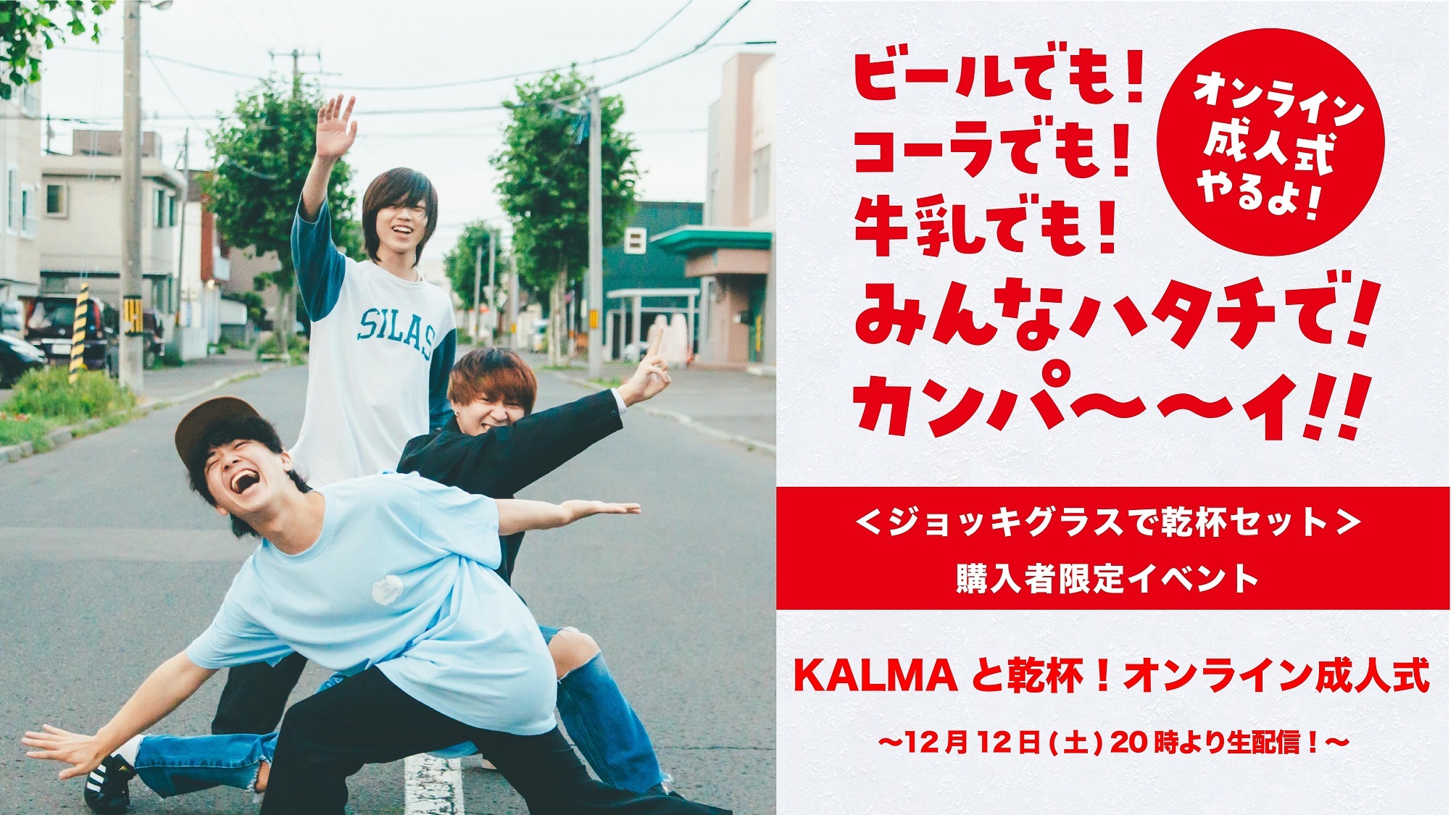 『KALMAと乾杯!オンライン成人式』は、リリース日までに全員が20歳を迎えるKALMAのメンバーとともに一緒に乾杯しよう! という企画で、12月12日(土)20:00より生配信予定。生配信ならではのスペシャルな内容となるので、お酒やソフトドリンクを注いだオリジナルデザインのジョッキグラスを片手に一緒に楽しもう。