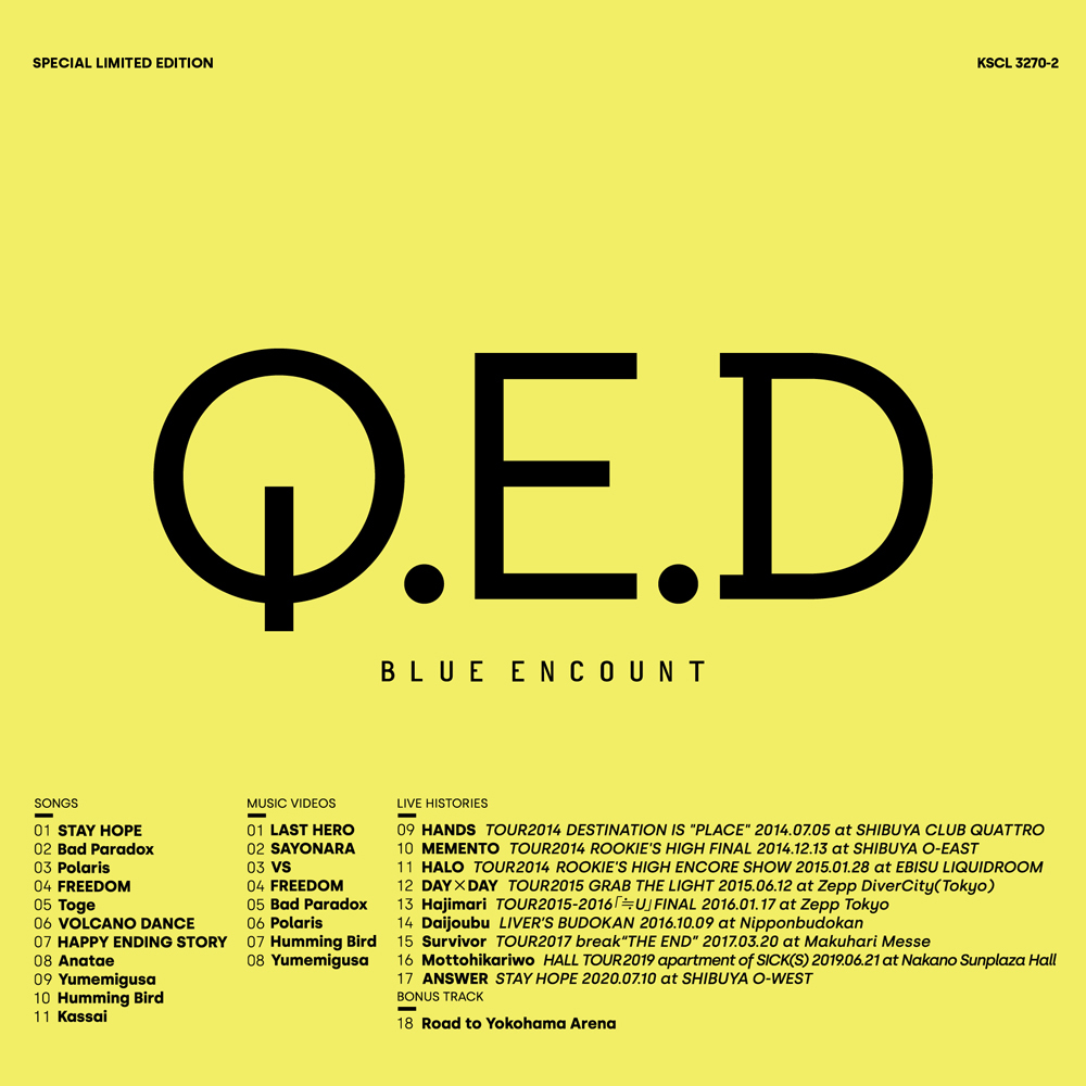 さらに、9月30日までにこの新作『Q.E.D』を予約すると、早期予約特典として<「Document of STAY HOPE」視聴カード>がプレゼントされる。この映像は2020年7月10日に行われたBLUE ENCOUNTによる初めての無観客配信ライブ『STAY HOPE』が行われるまでのドキュメンタリー映像となっている。
