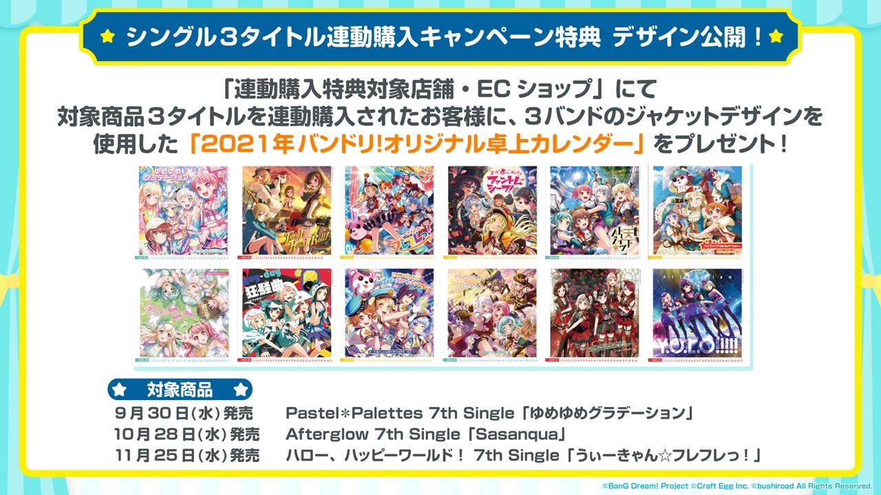 連動購入特典対象店舗・ECショップにて対象商品3タイトルを連動購入した人に、3バンドのジャケットデザインを使用した「2021年バンドリ!オリジナル卓上カレンダー」をプレゼント。そのデザインが公開された。