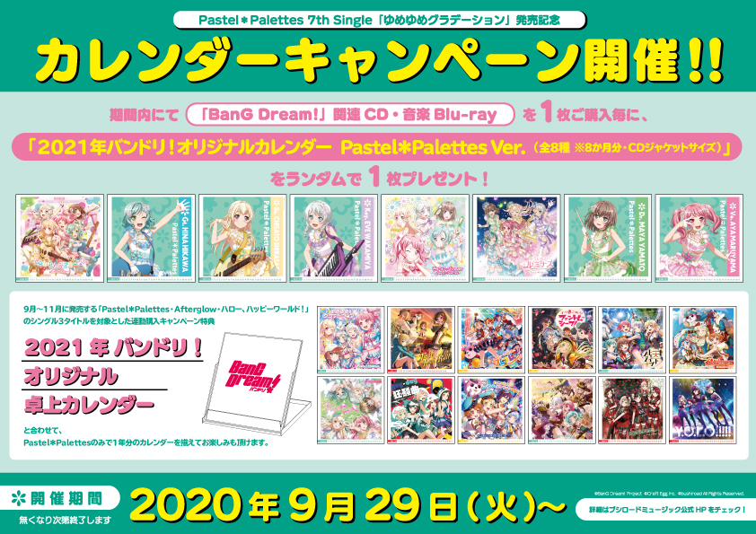 9月29日(火)より、対象店舗で「BanG Dream!」関連CD・音楽Blu-ray(新譜・旧譜含む)を購入した人に、「2021年バンドリ!オリジナルカレンダー Pastel*Palettes Ver.(全8種 ※8か月分・CDジャケットサイズと同一)」をランダムで1枚プレゼントする。ぜひ手に入れてほしい。