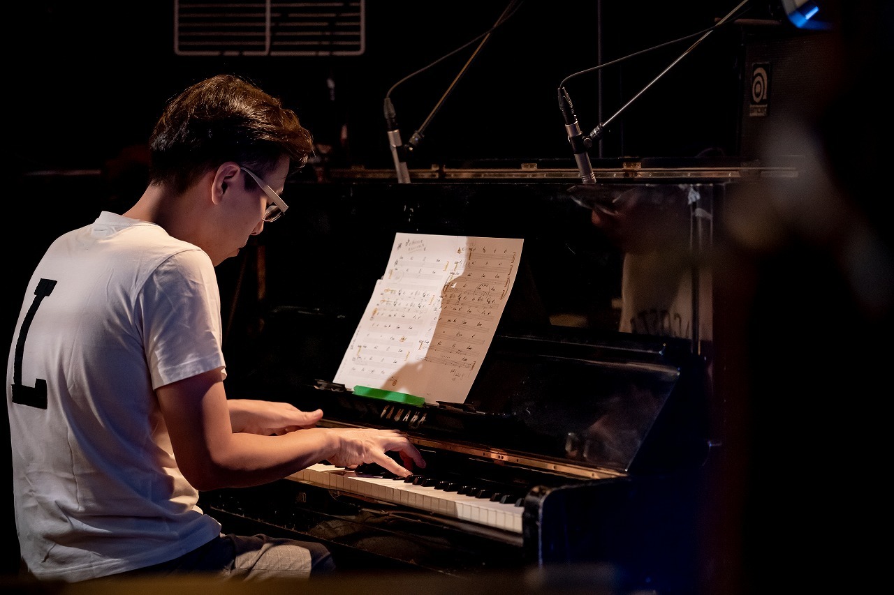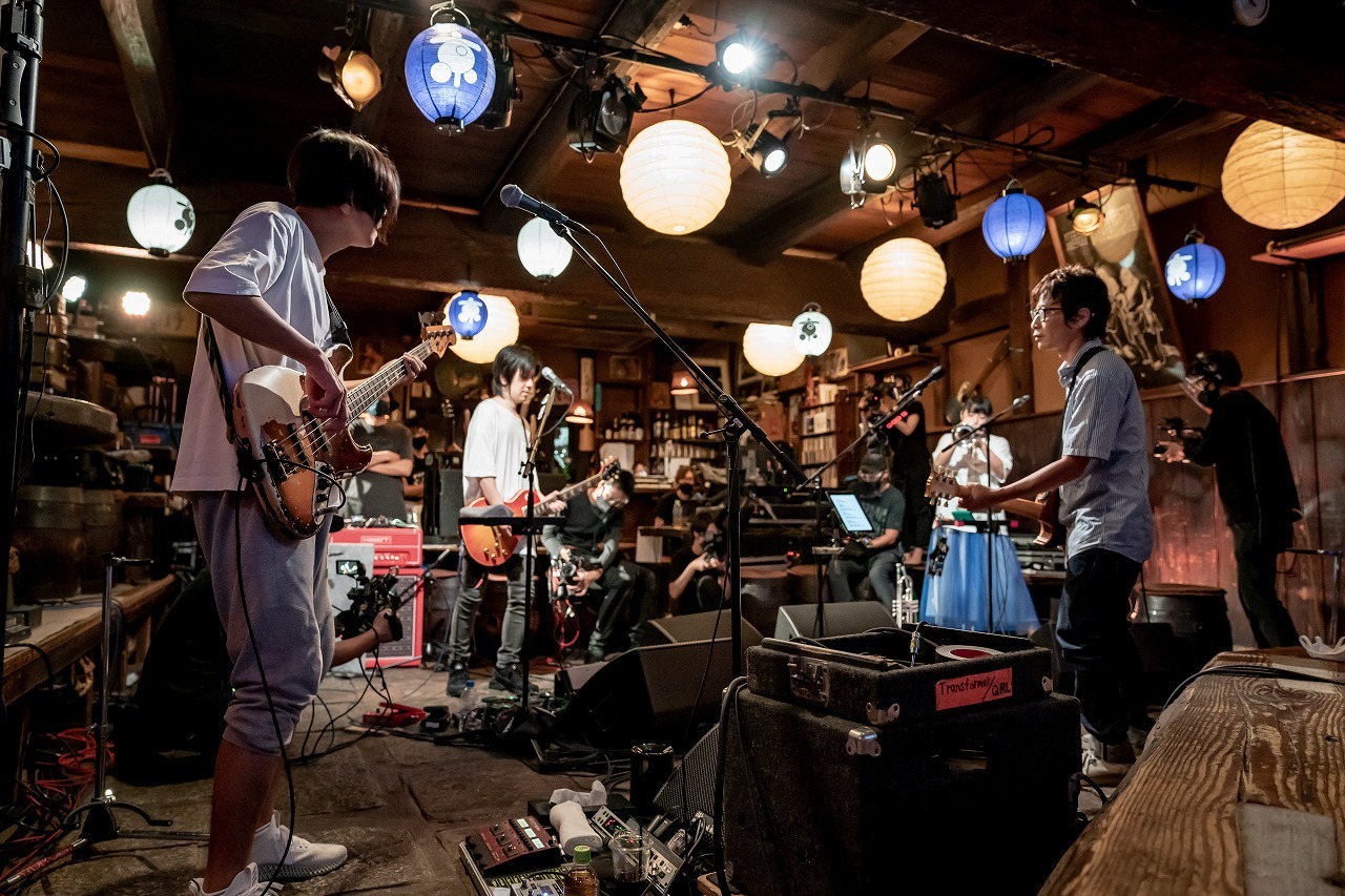 開場の19時からは、9月23日発売のミュージックビデオ集『QMV』に副音声として収録されたメンバーとスペシャルゲストのオーディオコメンタリーが画面に流される。開演の19時半になり、画面には梅小路公園、京都タワー、『音博』の暖簾が飾られている拾得が映り、「宿はなし」のイントロが流れ、「配心」と大きく映されている。そして、事前に公開された岸田繁楽団のマニフェスト「1.誰でも入れる楽団 2.どこでも演奏する楽団 3.なんでも演奏する楽団 です。」も映される。楽団長、作編曲、ギター・岸田を始め、編曲家、コンダクター・三浦秀秋、ヴァイオリン・須原杏、ヴァイオrン・福岡昂大、チェロ・小棚木優、コントラバス・山西葉月、オーボエ・福盛貴恵、クラリネット・副田整歩、ファゴット・浦田拳一、ホルン・米崎星奈、ピアノ・野崎泰弘、ドラム・石若駿という総勢12人。バーカウンターの中に岸田がいて、そこから円状に広がる様に楽団員が配置されている。普段はステージだけに演奏者がいるが、今日は客席も含め、拾得全体を使ってのライブ。本当に“どこでも演奏する楽団”であることが伝わってくる。