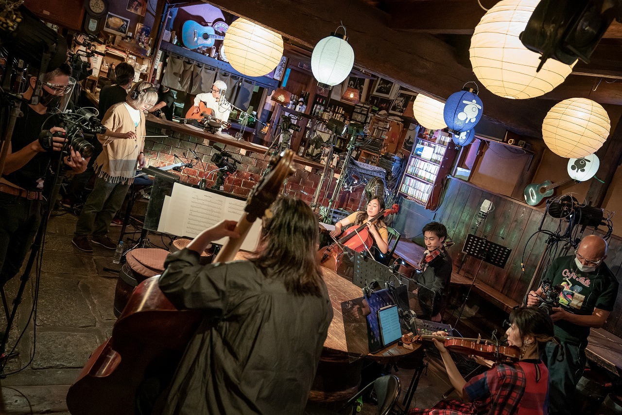 最初に「Main Theme」が演奏され、楽団という形態を目の当たりにした時、岸田繁という人は、今まで誰もやっていないことに挑戦する人なんだなと改めて実感する。1曲目終わり、岸田がパソコンで今回の楽曲に関する作業をする姿が映される。1995年、1996年のアマチュア時代には、しょっちゅう拾得で演奏していたとも話す。配信とは言え、拾得でくるりを、岸田繁を聴けるのは凄く貴重なことだ。続く、THE BOOM「島唄」のカバーでは沖縄三線の音色がヴァイオリンで表現され、本当になんでも演奏する楽団であることも伝わってくる。