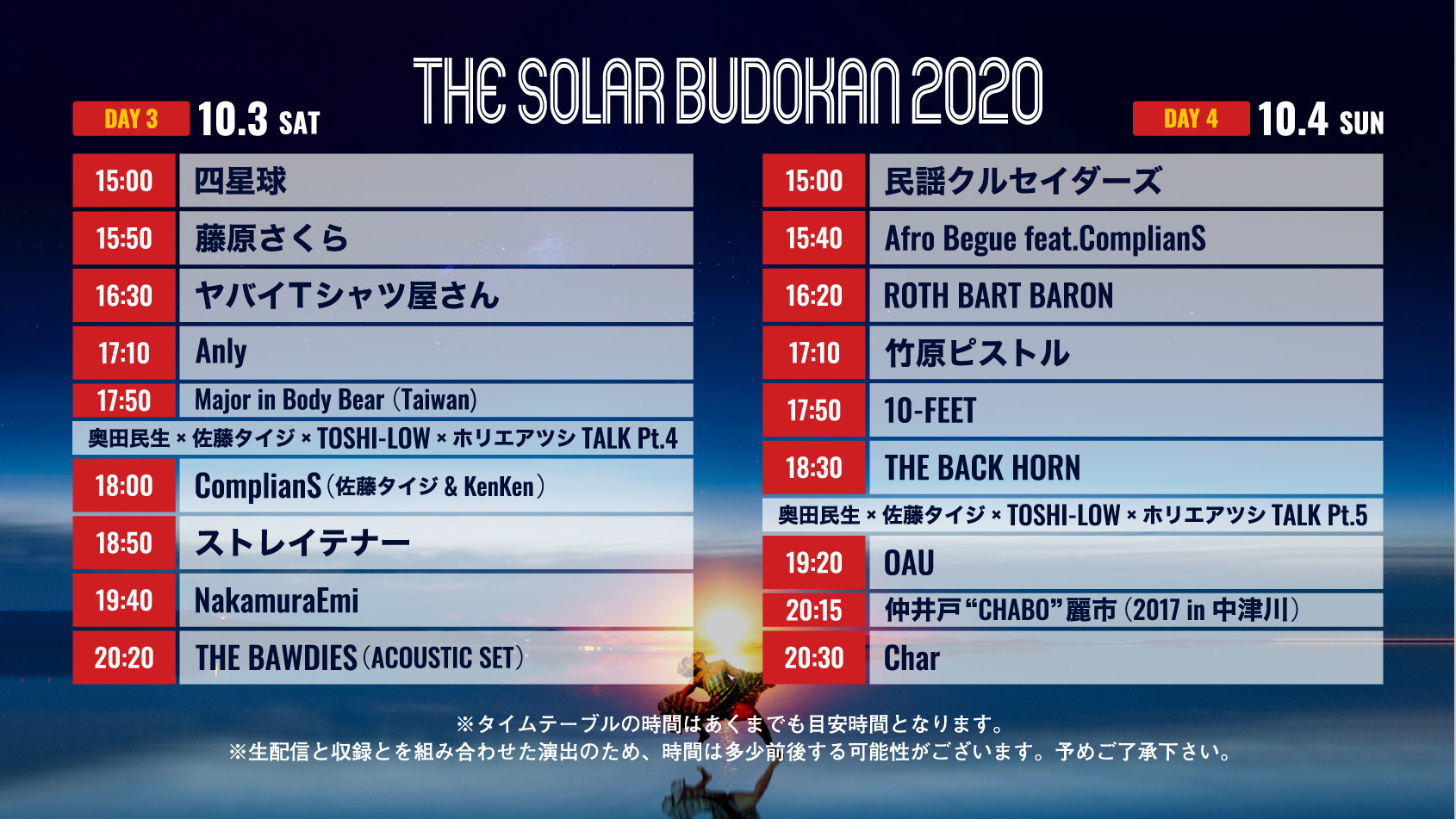 9月26日よりスタートした、太陽光発電のエネルギーを活用したロックフェス『THE SOLAR BUDOKAN 2020』。その配信2週目となる10月3日(土)、4日(火)のタイムテーブルが発表された。