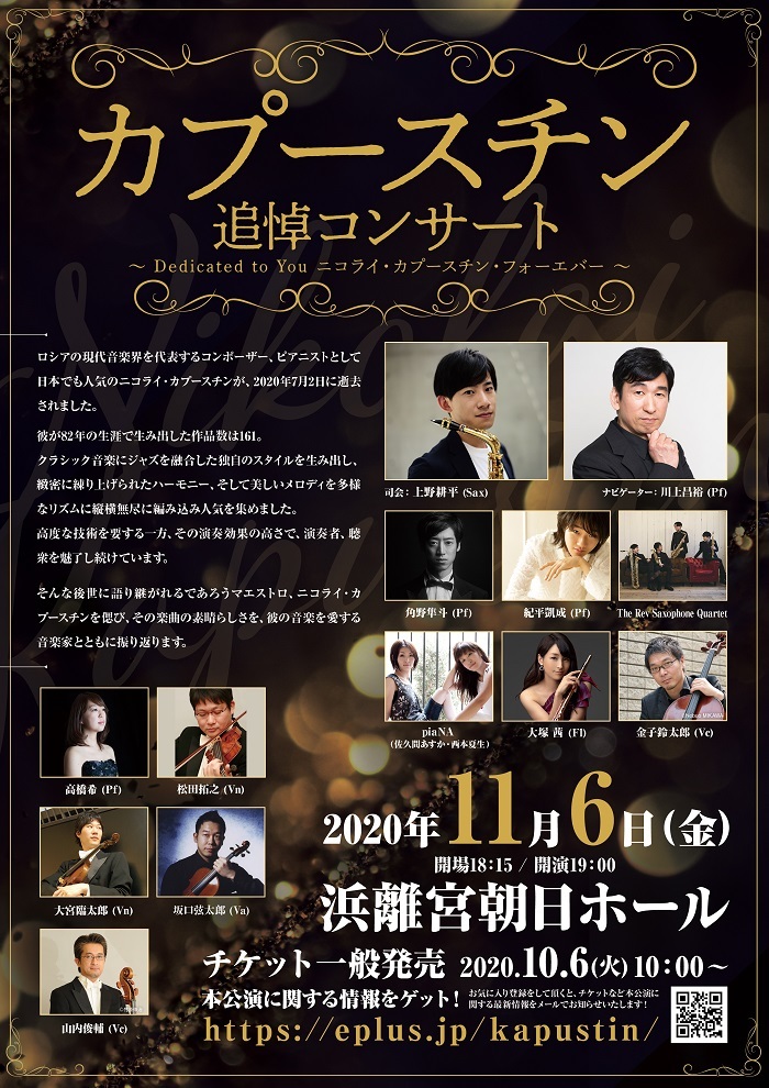 2020年11月6日(金)東京・浜離宮朝日ホールにて、『カプースチン追悼コンサート〜Dedicated to You ニコライ・カプースチン・フォーエバー〜』が開催されることが決定した。本公演はイープラス・Streaming+での配信も行われる(見逃し配信はなし)。