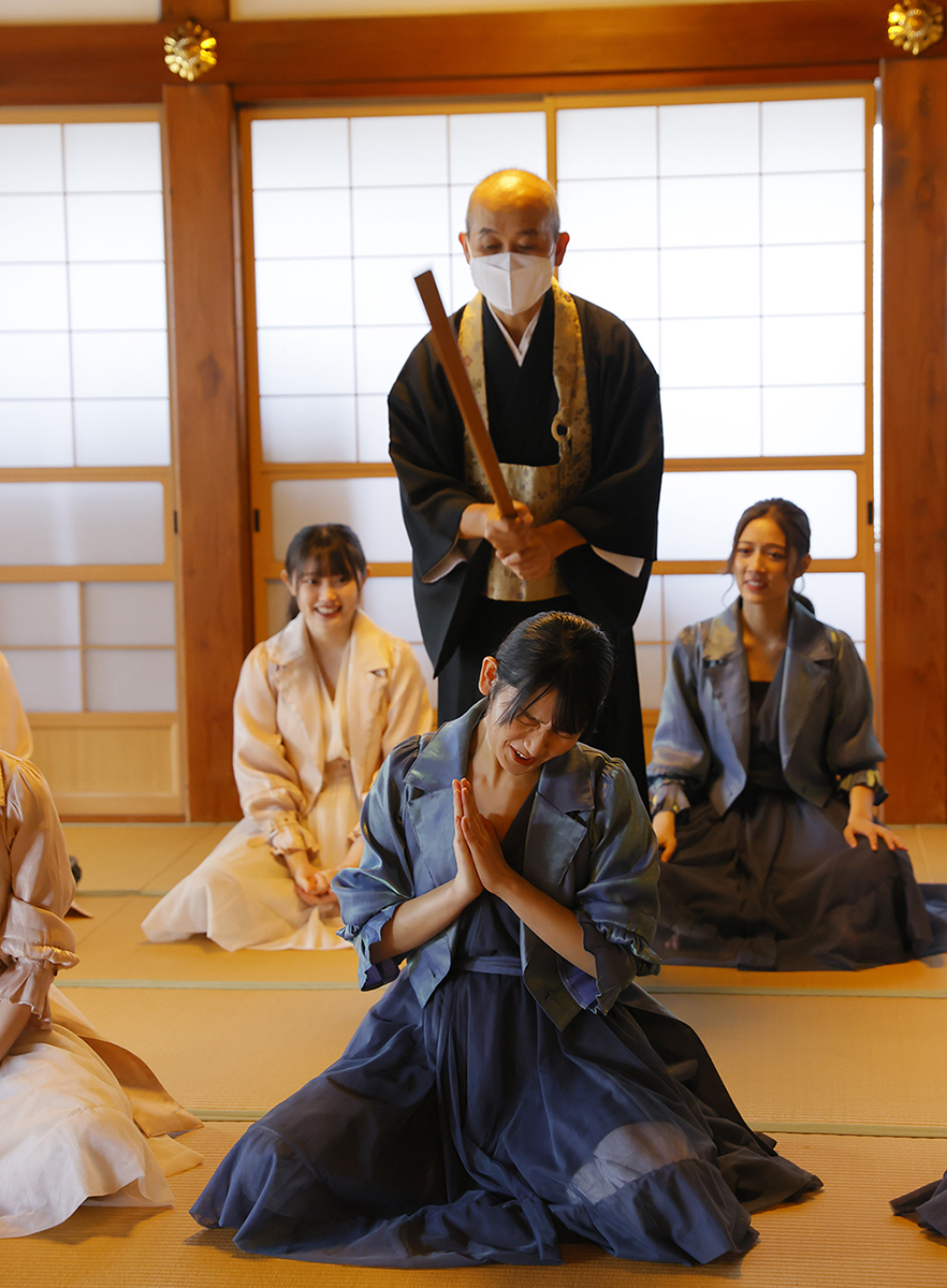 今回の座禅体験は、ニューシングル表題曲の「断捨 ISM」の曲名にちなみ、各メンバーが邪念を捨てて心を清めるべく行われたもの。座禅では行中の姿勢に乱れがあった場合に「警策」(読み:けいさく、きょうさく)という棒で肩を打たれるのが習わしとなっているが、つばきファクトリーの9人は住職に心得を教わったあと座禅を通して一時“無”の状態を体感。初めての座禅は全員一度も肩を打たれることなく完遂し、終わった後にはメンバー本人達の希望で警策も体験する形になった。