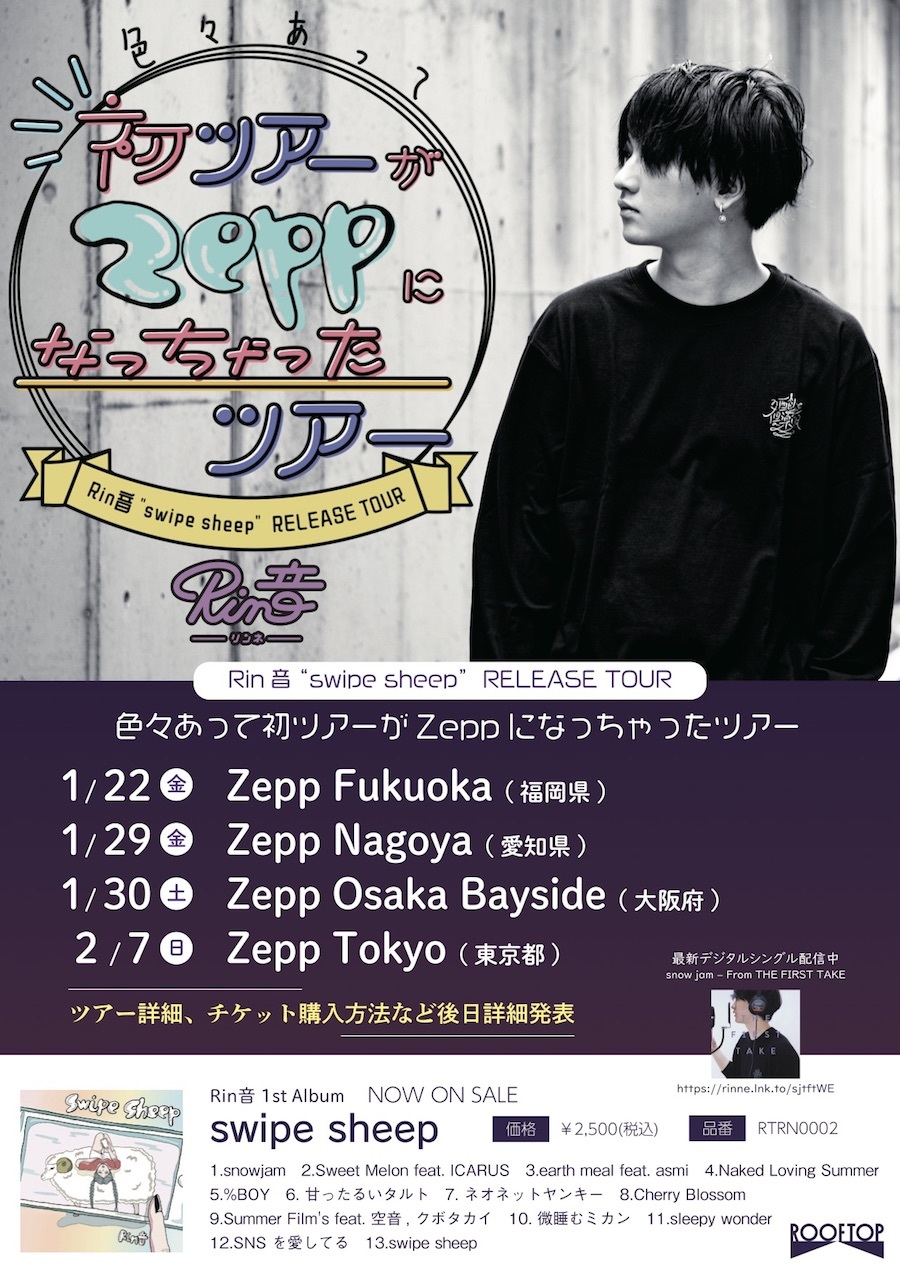 Rin音の1stアルバム『swipe sheep』のリリースツアー『色々あって初ツアーがZeepになっちゃったツアー』の開催が決定した。