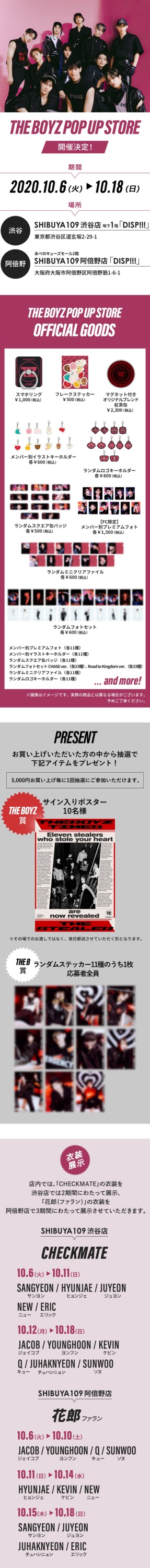 『THE BOYZ POP UP STORE』では、ミニアルバム『CHASE』から、ポップアップストア限定の写真を使用した限定アイテムの他、THE BOYZが優勝を果たし人気を博すキッカケともなったサバイバル番組『Road to Kingdom』の素材を使用したランダムフォトセットも販売予定。