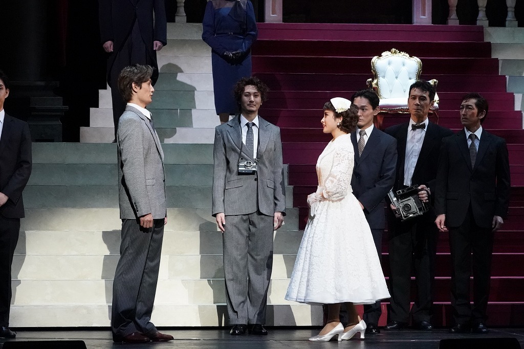 そんなアン王女に対し、確かな包容力を発揮する加藤和樹がすばらしい。スーツがよく似合い、パンツのポケットに両手を突っ込んでいるだけで様になるのだが、その同じ姿が、物語の序盤と終盤とでは、ジョー自身の心の動きもあって意味合いが違って見えてくる。余裕のある大人の男性とはいえ、その中にはやはり、ふるえ、ゆれる心がある。そんな彼が、自分の思いを押し殺し、終盤で王女の決断に対して寄せる温かな眼差しに、さすがの大人の男の包容力を感じさせる。ちょっとしたしぐさや間の取り方がうまく、大いに笑いを誘ってコメディ演技も行けるところをアピール。かっこよさ、チャーミングさ、コミカルさ、さまざまな顔が見られて、加藤にとってはまり役である。