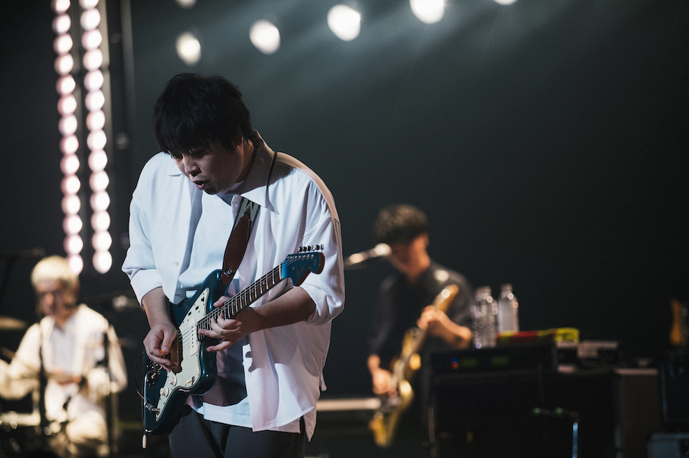 来場者は予め個人情報を記入したシートを手に、前後左右距離を取って並び、検温・消毒を済ませてから入場。ガイドラインに従って間隔を空けた座席にて、会話を控えて開演を待っていた。SEが鳴り、本来ならば大歓声が起きるはずのところだが、それが難しい中、渾身の大拍手が会場に響き渡る。阪井一生(Gt)、尼川元気(Ba)、小倉誠司(Dr)、そし