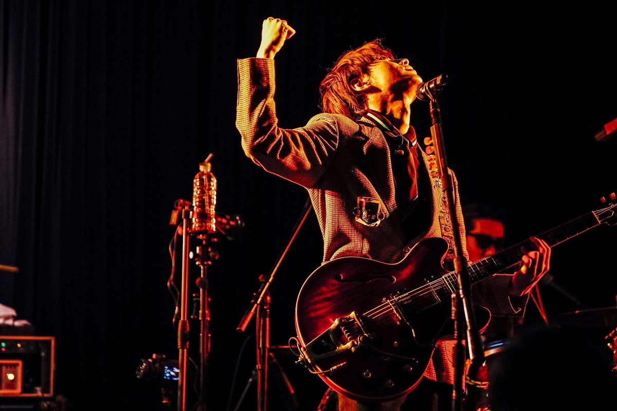 定刻になると、まず、ジェットセイヤ(Dr)がフロア後方から登場し、客席間の通路を通ってステージへ。同じように、長谷川プリティ敬祐(Ba)、柳沢 進太郎(Gt)、牧 達弥(Vo/Gt)の順で入場すると、既に楽器を鳴らしているセイヤに合流する形でステージに着いたメンバーから音を出していく。今日は特別に4人ともスーツ姿。プリティが短パンじゃないのはレアだが、セイヤはサングラスも込みで正装という認識か。
