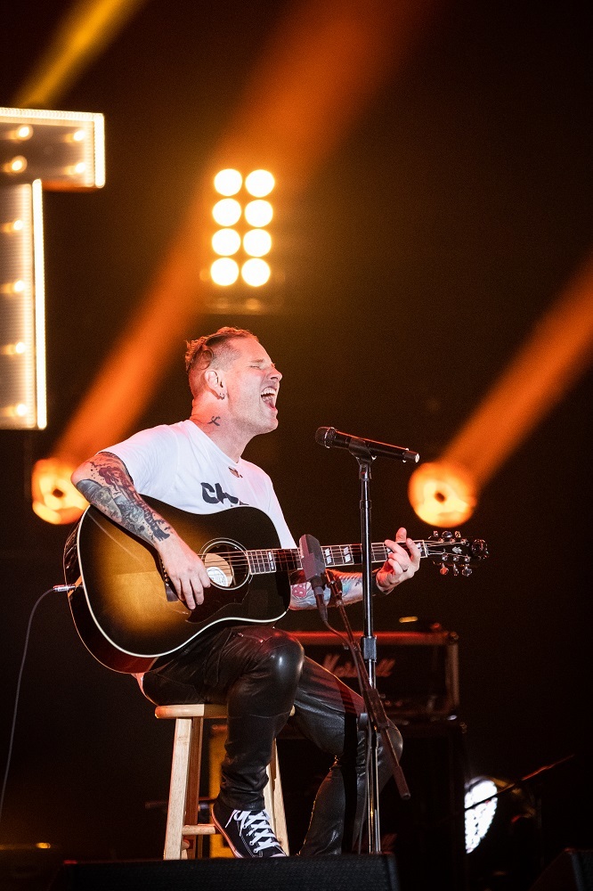 実際、『CMFT』という作品自体にも、スリップノット、ストーン・サワーでの彼の姿からは考えられないほど多種多様な楽曲が詰め込まれており、しかもカントリー/フォーク的な空気感をまとった楽曲からバンクとメタルの合体を思わせるもの、ピアノ・バラードからラップに至るまでの楽曲が無理なくひとつの流れを作り上げている。そんなことを可能にしてしまうコリィのセンスと歌声自体にある種のマジックを感じずにいられないわけだが、そうしたヴァラエティ豊かな楽曲たちとさまざまなカヴァー曲のマッチングも見事だった。ザ・デッド・ボーイズのパンク・チューン、カントリー・フレーヴァ―たっぷりのイーグルスの有名曲、昨年9月に他界したエディ・マネーや、ジョン・キャファティ&ザ・ビーヴァ―・ブラウン・バンドのヒット曲、さらにはKISSに至るまでのさまざまなカヴァーがごく自然に溶け合ってしまうというのは、まさに彼のライブならではの興味深さといえるだろう。