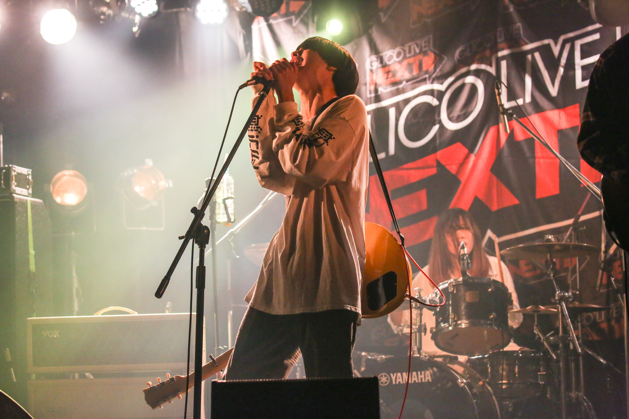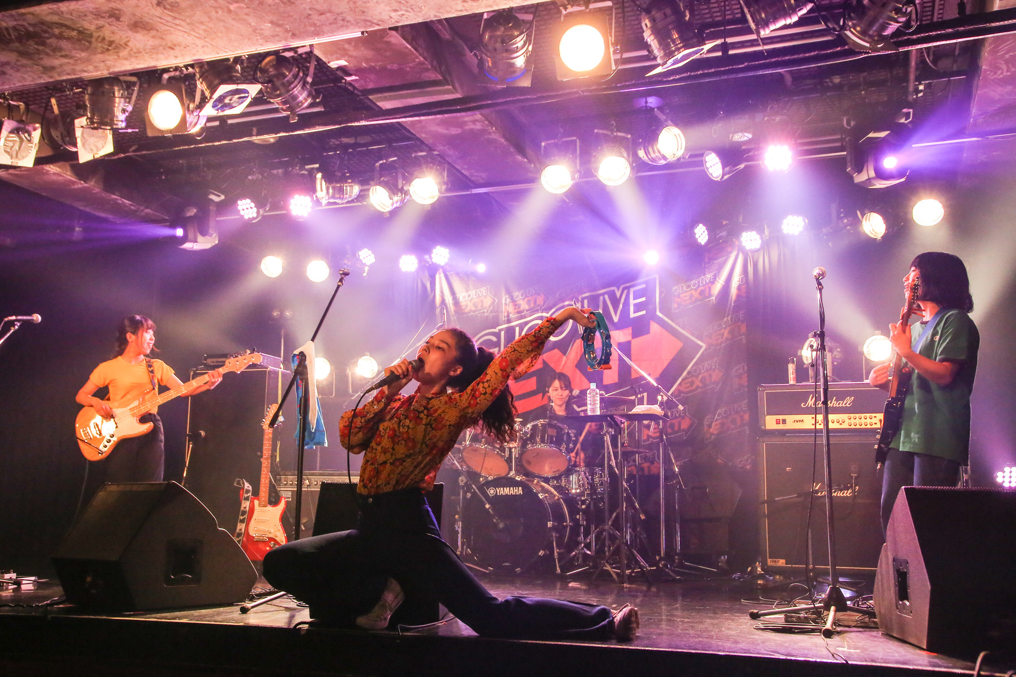 「『GLICO LIVE NEXT』、呼んでいただいてどうもありがとうございます! むちゃくちゃ楽しみにしてました。同年代の3組やし、すでに楽しいです。今日は新曲やろうかなと思ってます」(リコ、以下同)と流れ込んだ「(仮)アバラと火傷とロック」は、サビで四つ打ちにスイッチする新境地のポップソング。ぺっぺ(Gt)がエモーショナルなギターを存分にかき鳴らしたかと思えば、はな(Ba)の重たいビートに導かれた「メアリーちゃん」では、巻き舌で吐き捨てるように歌うメランコリーな失恋ソングに悶絶。続いて、「やっほー、ヤユヨです。皆さんはお家で見てるんですかね。近くにいい楽器があれば叩いてくれてもいいし、手拍子でもいいし、一緒に楽しんでください!」と誘った「ユー!」では、リコもタンバリンを手にステージを闊歩し、半分のけぞりながら(笑)全身でその想いを伝えていく。