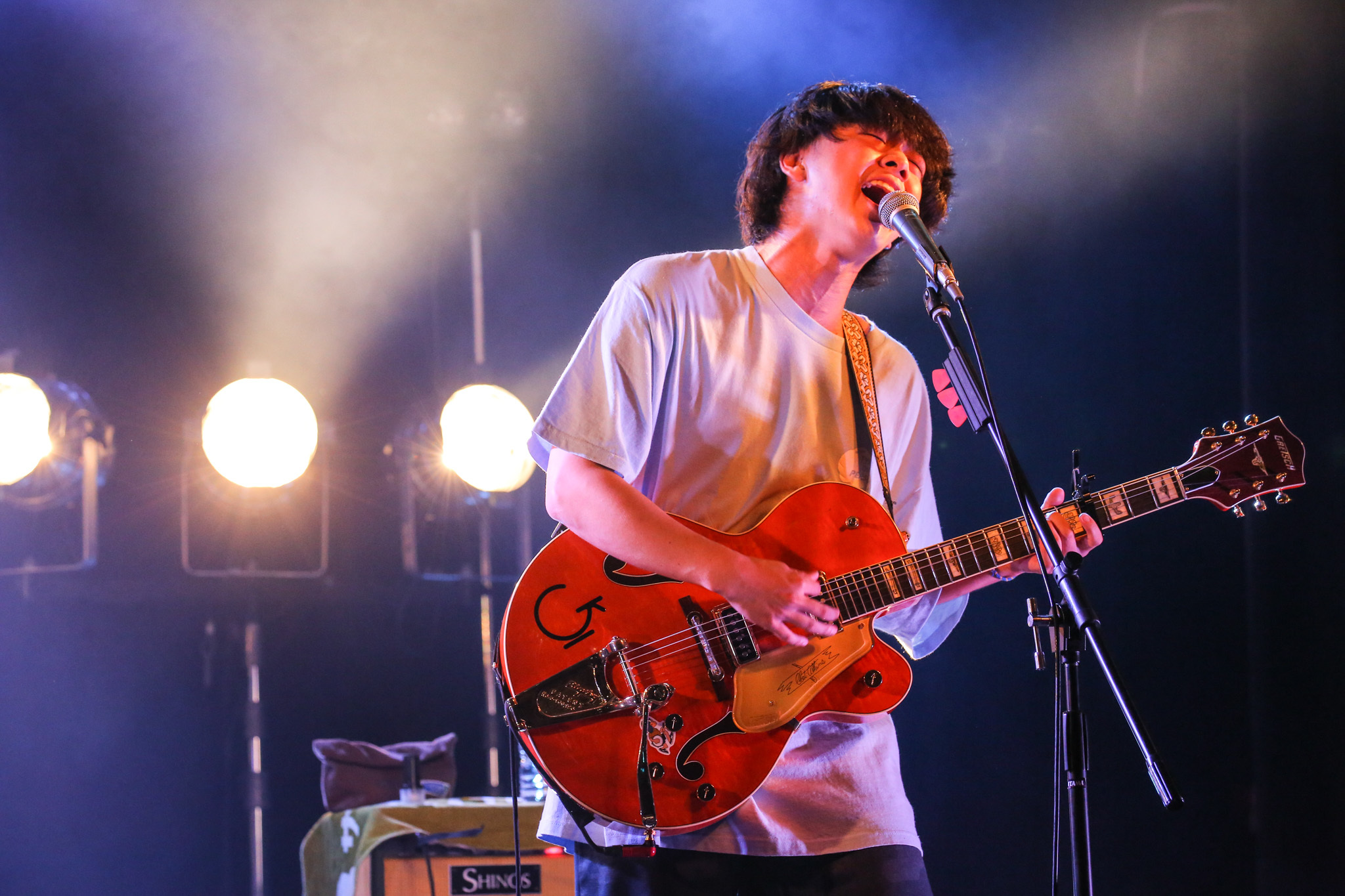が、ここで突然「今日は無観客だからお客さんの声がないんだよ。だから2人ももっと歌って!」、「今のコール&レスポンス、予定してなかったじゃん?」(畑山)などと、バンドの内情をぶちまける光景も、微笑ましいやら危なっかしいやら(笑)。普段のスタジオリハの風景が思い浮かぶようなやりとりを、ステージ上でも力技で成立させてしまうキャラクターには早くも虜に。ライブ中にフロアから受け取ったセレクション・ザ・グリコ(=グリコのお菓子詰め合わせ)に、「こんなんなんぼあってもいいですからね」とさらりと返すのもさすがだ(笑)。