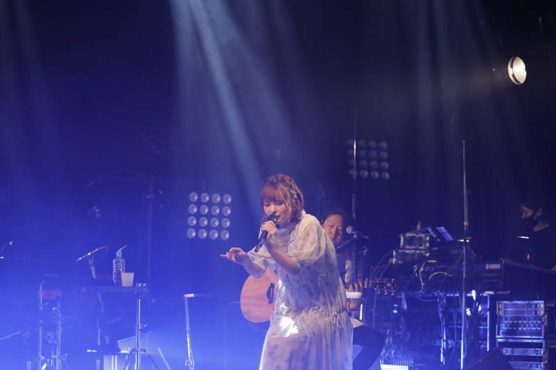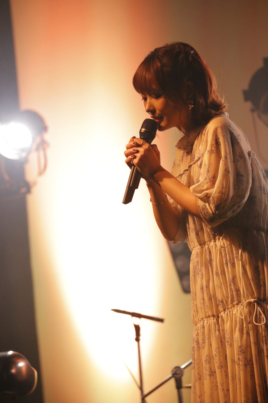 トークを終えてライブコーナーが再開すると、ハイチェアに腰掛けたままバラードナンバーの「ラララ〜君へ贈る歌〜」「雪に咲く花。蜃気楼。」を披露。思い入れがあるという「ラララ〜君へ贈る歌〜」は、亡き愛鳥・チェルシーを想って渕上自身が作詞した"別れの曲"ではあるが、切ないながらも前向きな歌詞となっており、静かにまぶたを閉じて歌声を紡ぎ出す場面も。「雪に咲く花。蜃気楼。」はこれまで作詞した中でも特に好きな楽曲ということで今回チョイス。セピア調の映像も相まって、ぐっと曲の世界観へと引き込まれた。