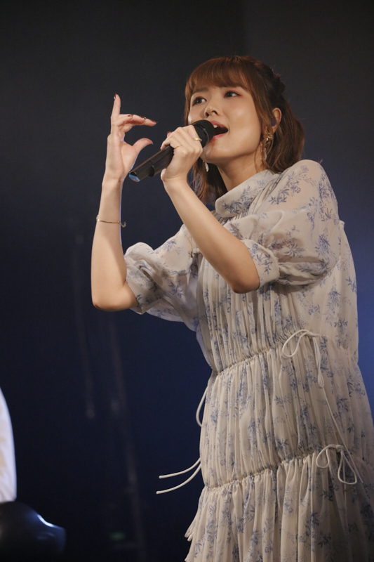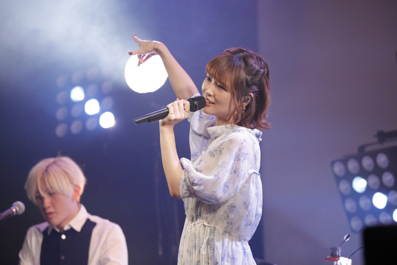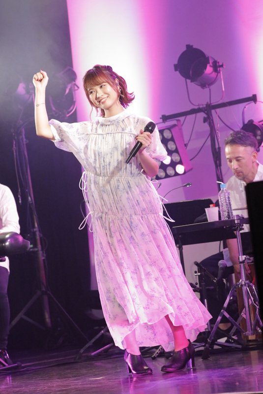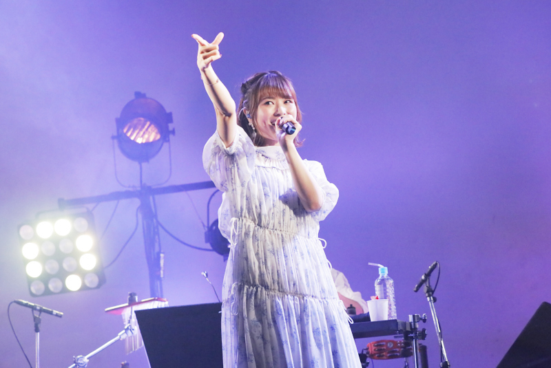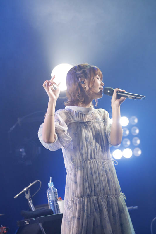「もっともっとゆるく歌ったらどうなるんだろう」と試行錯誤して作り上げたという「Cute♡Appeal」では、距離感がより縮まり、カメラの目の前でピースやウインクをする渕上のひたすらにキュートな姿にハートを撃ち抜かれるファンが続出。そして、「Cute♡Appeal」と同じくデビューアルバム『Fly High Myway!』に収録されている「Beautiful Sunday」では、ステージから降りて客席フロアに作られた特設ステージへ。バンドメンバーと向かい合う形で歌い上げる。クラップを交えて楽しめる楽曲のため、配信チャット欄には多くのファンから手拍子の絵文字が投稿され、温かさの感じられる一曲となった。