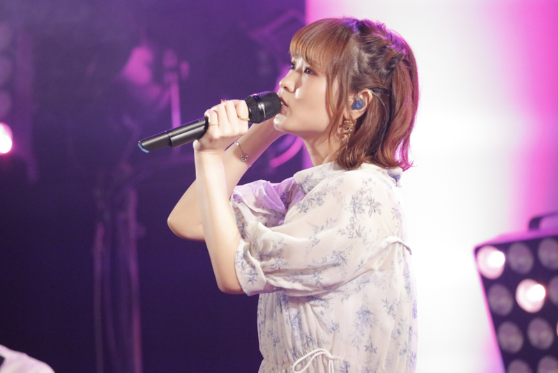 会場内の映像に切り替わると、バンドメンバーによるオープニング曲に合わせて渕上がステージに登場。そして早速、今年4月に発売となった最新シングルより、TVアニメ『食戟のソーマ 豪ノ皿』ED主題歌の「Crossing Road」を披露した。オリジナルでは疾走感あふれるドラムやストリングスの音色も際立っている楽曲だが、ピアノにアコースティックギター、カホンというシンプルな楽器編成でアレンジされ、やわらかなバンドサウンドに澄んだ歌声を重ねて彼女らしい調和を生み出していった。そのしっとりとした余韻から続けて、2曲目には「予測不能Days」(TVアニメ『魔術士オーフェンはぐれ旅』ED主題歌)を届ける。AメロからBメロにかけて徐々に熱を上げていくと、サビではカラフルなライトに照らされながら軽やかなステップを踏み、オリジナルとはまた違った"明るさ"の感じられる歌唱となった。同曲のミュージックビデオを彷彿とさせる、CGを使った配信ならではの演出も印象的だ。