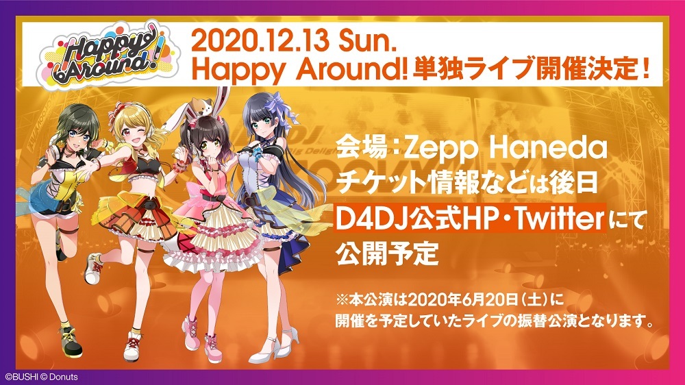 また、ライブ内告知パートでは今年12月にHappy Around!の単独ライブが開催されることを発表。 同ライブは2020年6月20日(土)に開催予定だったが、新型コロナウイルス感染拡大の影響で延期になっていた。振替公演の実施を待ち望んでいたファンも多く、会場内からは喜びの拍手が上がった。