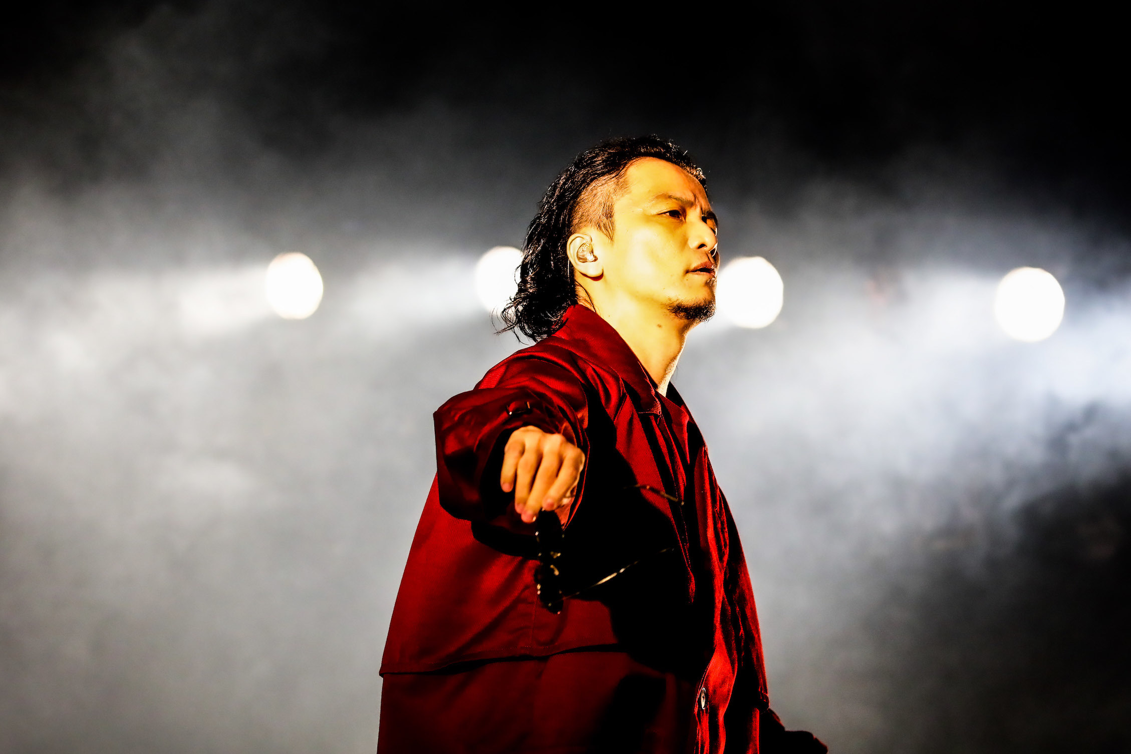 豪雨のようなフラッシュライトに打たれながらの「基準」では、ヘヴィなギターリフをかいくぐるように矢継ぎ早にメッセージを突き刺し、演奏する喜びを存分に味わうバンドメンバーとの黄金配合で、「ストロングスタイル」でもモノの違いを見せつけるステージを展開。これぞプロフェッショナルな王者の風格、楽曲とシンクロする光のドラマには心底シビれた。
