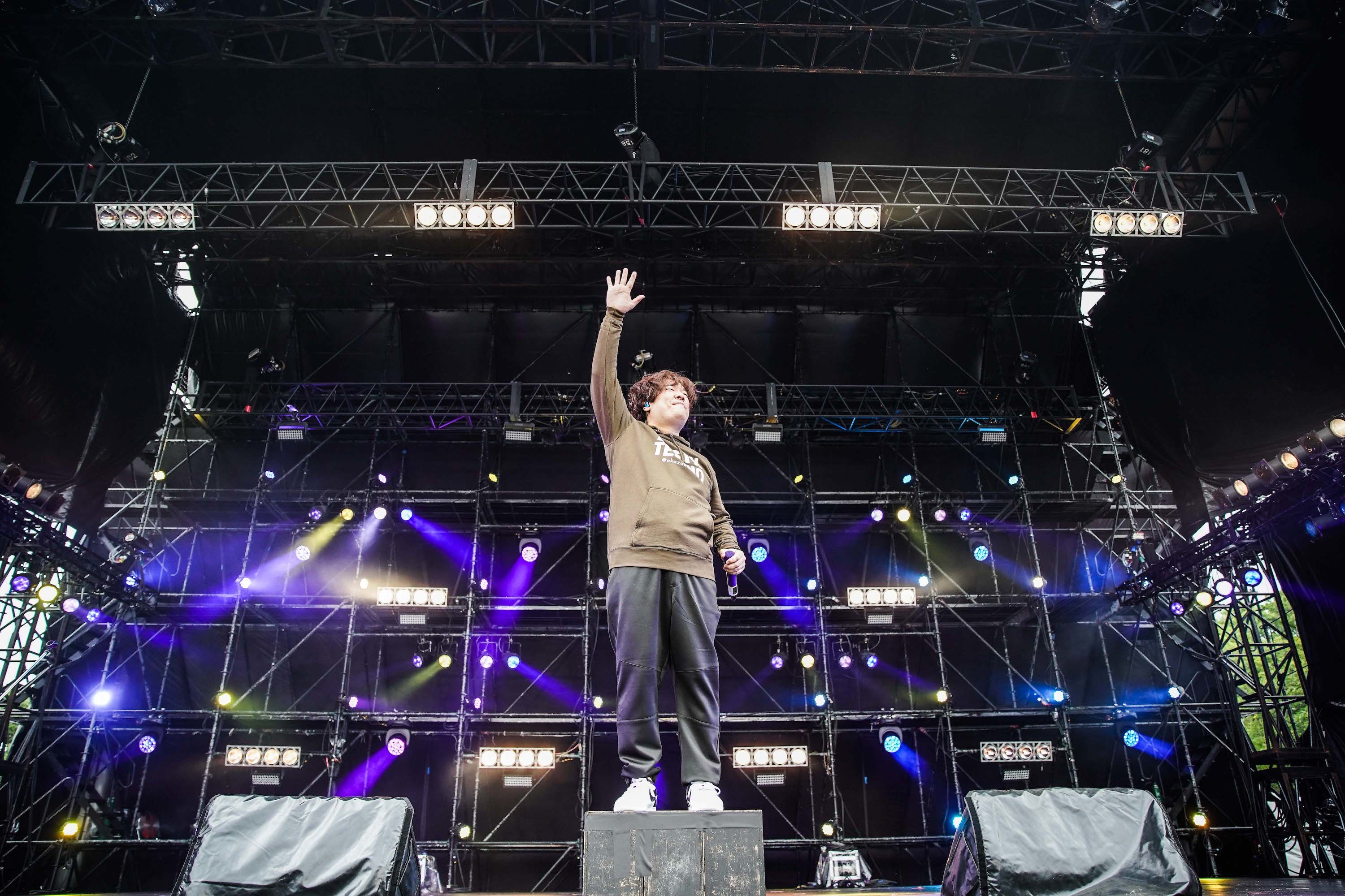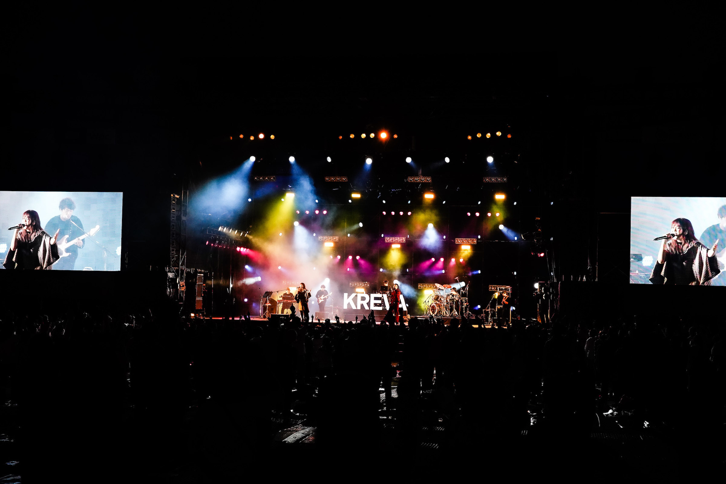 陽が落ち始めた「RIGHT STAGE」を鮮やかな照明とグルーヴィーなバンドサウンドが染め上げるなか、満を持して登場したのがKREVAだ。「パーティーはIZUKO?」からステージを横断し、アグレッシブなパフォーマンスで観る者をロックオン。「そこのTシャツ着てる子、1から5の数字どれがいい?」とオーディエンスに尋ねたかと思えば、その数字通り即座に「ツータイムス!」と楽曲をシメたのもさすがのひと言。