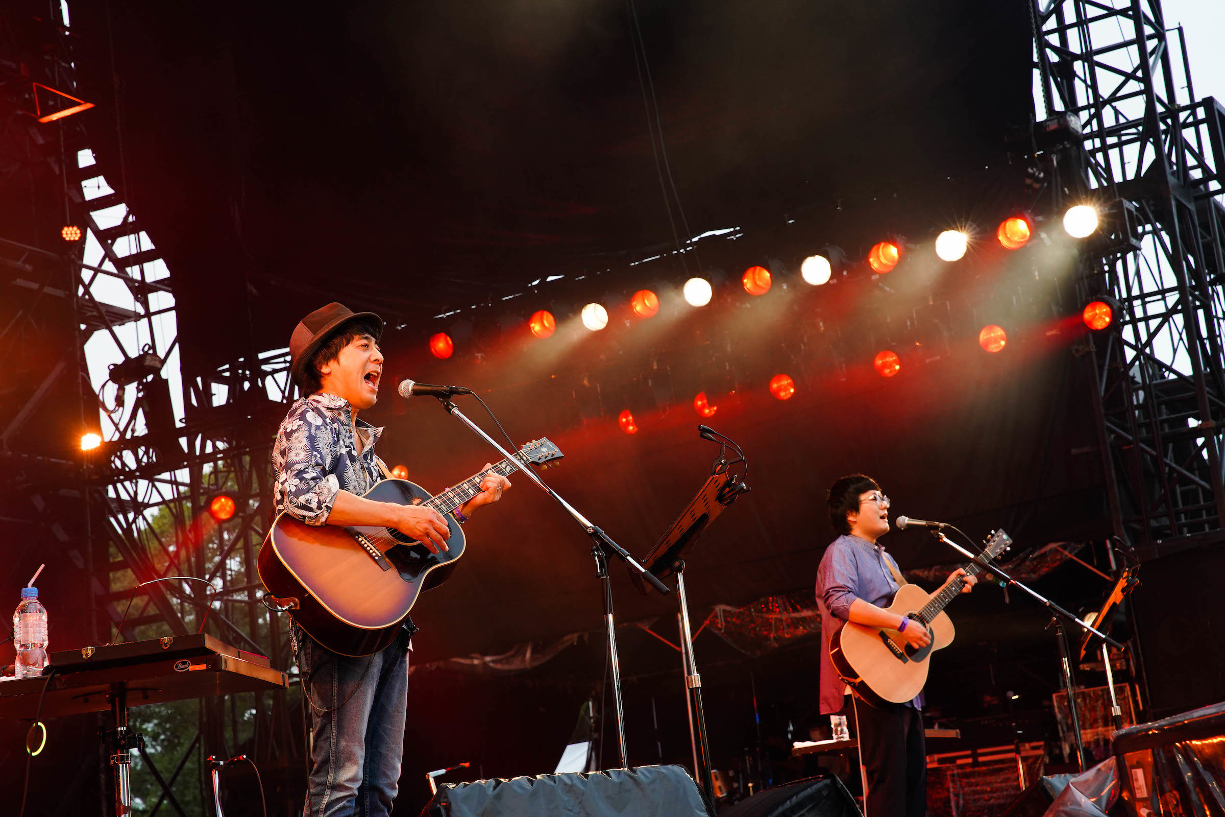 昨年、ライブドキュメンタリー番組の収録で長崎県の離島・五島を訪ねた山崎まさよしと松室政哉。音楽事務所オフィスオーガスタの先輩/後輩でもある2人のシンガーソングライターが、『OSAKA GENKi PARK』ではどんな化学反応を見せるのか? その出演が発表された時点から興味深いライブとなっていたが、「2人合わせて山室まさ哉です!」(山崎)、「全然知らんおっさんの名前になりましたけど(笑)」(松室)と、しょっぱなのMCから気心知れた良いムード。まずは山崎まさよしの楽曲「未完成」を、一番は松室、二番は山崎といったように、持ち場と見せ場が入れ替わるスタイルで魅せていく。