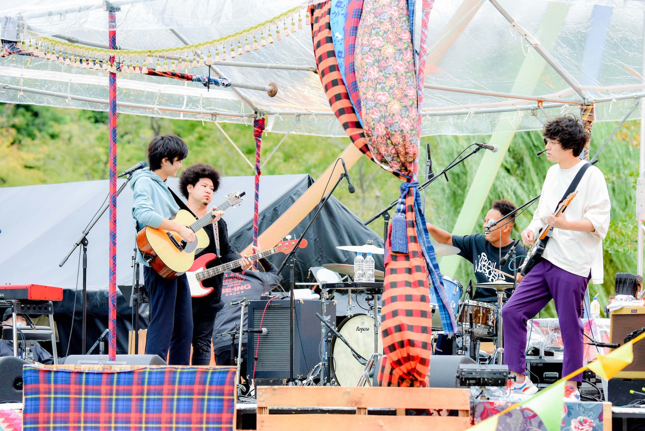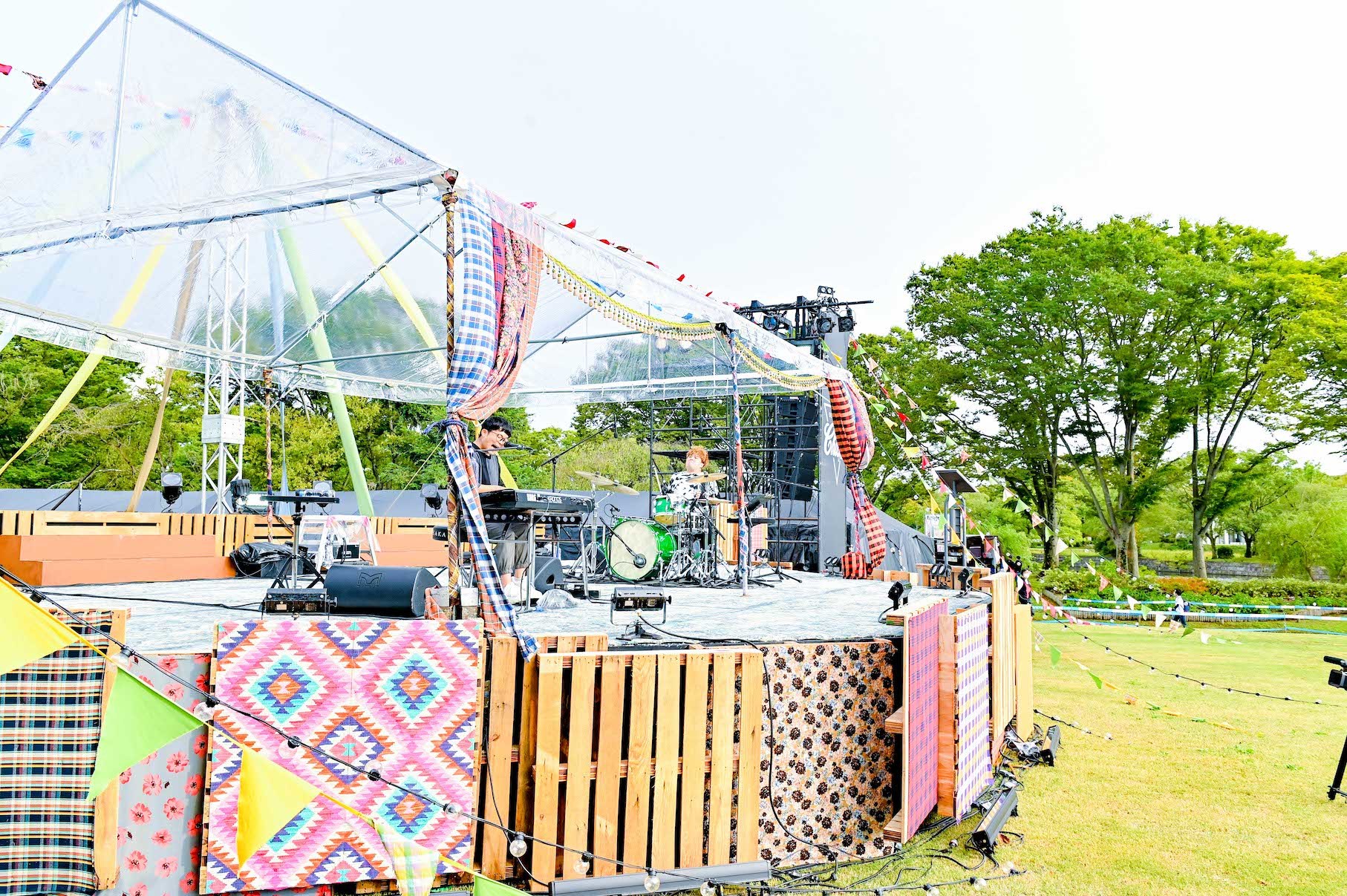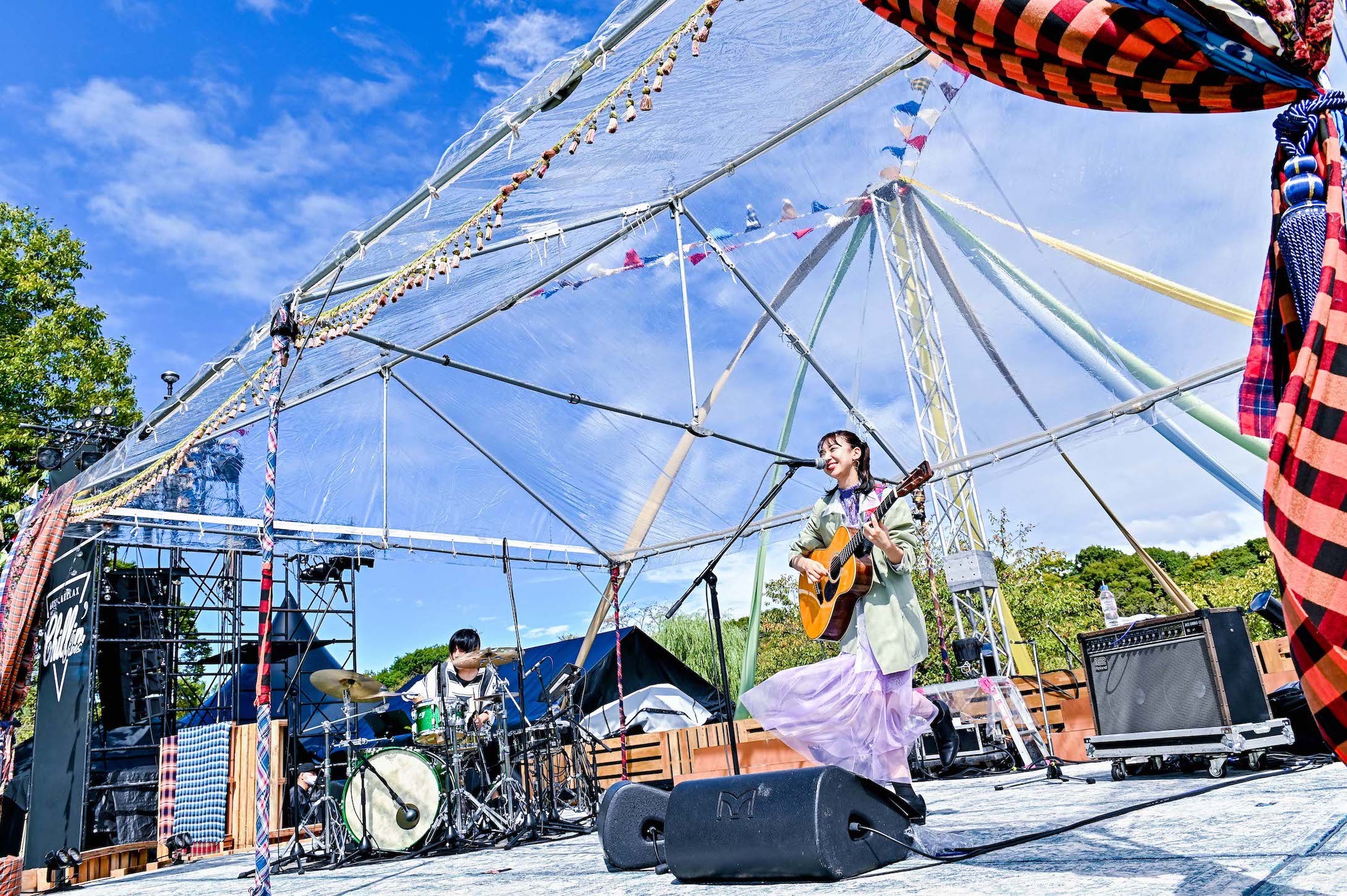 1曲目「SUNKISSed GIRL」から、竹内のアコギは軽快なメロディーを奏で、そして岡本の刻むビートはタイトで、ふたり編成ならではのシンプルで真っ直ぐなサウンドに仕上がっている。観客は入場口で配布されるレジャーシートを芝生にひいて、ピクニック気分で楽しむ。曲の終盤では風も吹き出し、より居心地の良さを感じる。アメリカ・ロサンゼルス生まれだけあって、英語で歌う姿も様になり、もちろん意味が全て分かるわけではないが、自然に英語詞が耳に入ってくる。