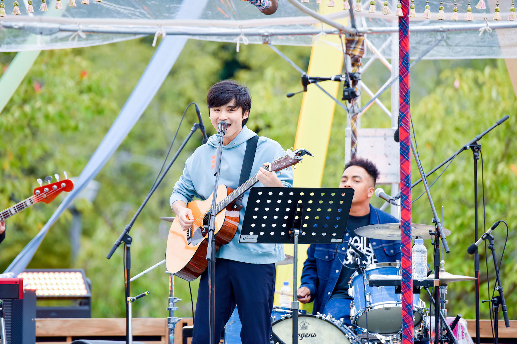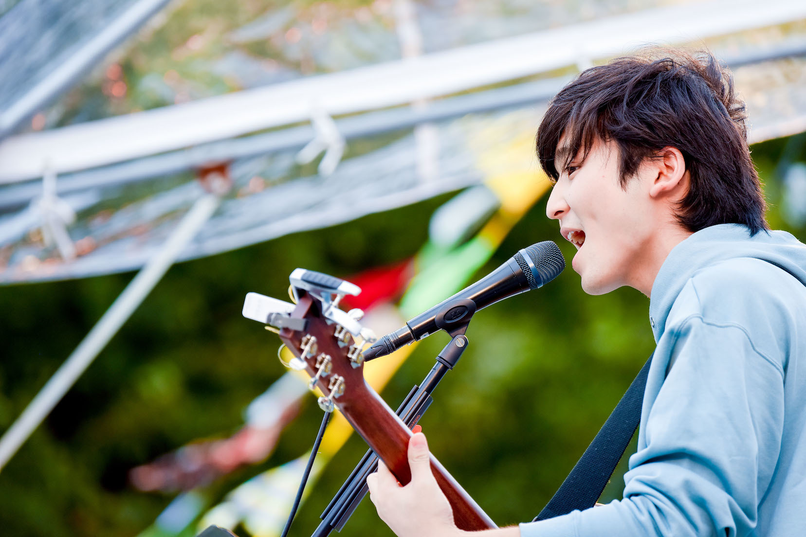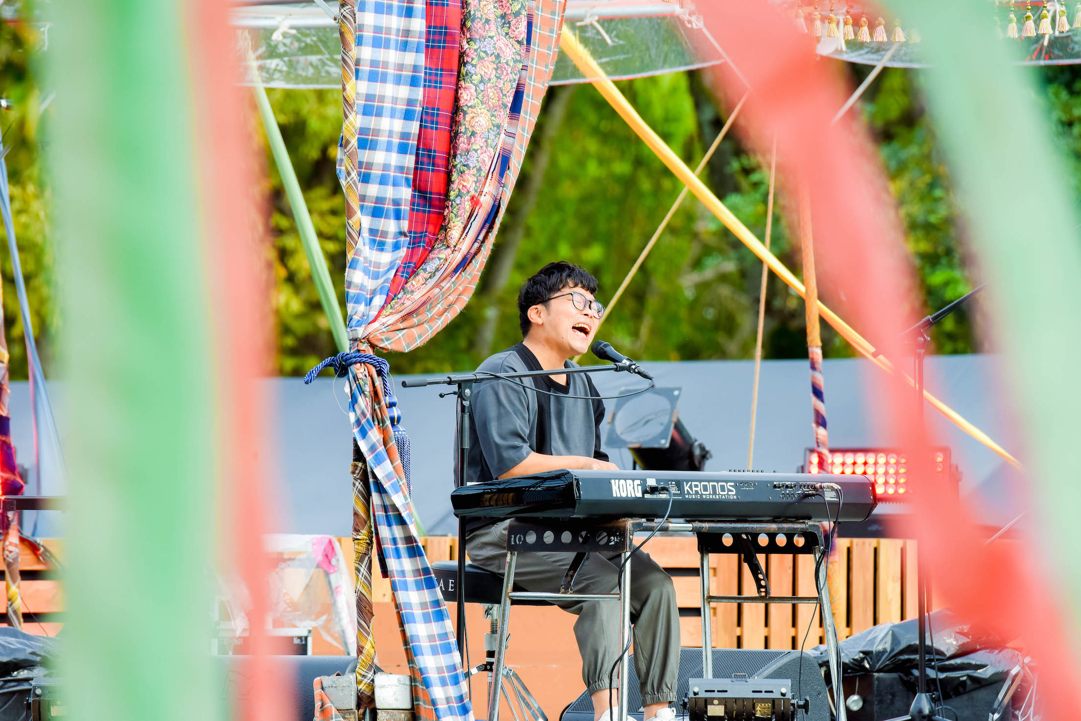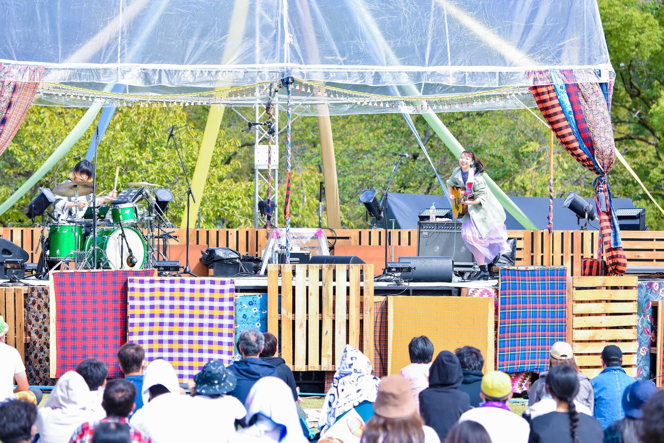 1曲目「SUNKISSed GIRL」から、竹内のアコギは軽快なメロディーを奏で、そして岡本の刻むビートはタイトで、ふたり編成ならではのシンプルで真っ直ぐなサウンドに仕上がっている。観客は入場口で配布されるレジャーシートを芝生にひいて、ピクニック気分で楽しむ。曲の終盤では風も吹き出し、より居心地の良さを感じる。アメリカ・ロサンゼルス生まれだけあって、英語で歌う姿も様になり、もちろん意味が全て分かるわけではないが、自然に英語詞が耳に入ってくる。