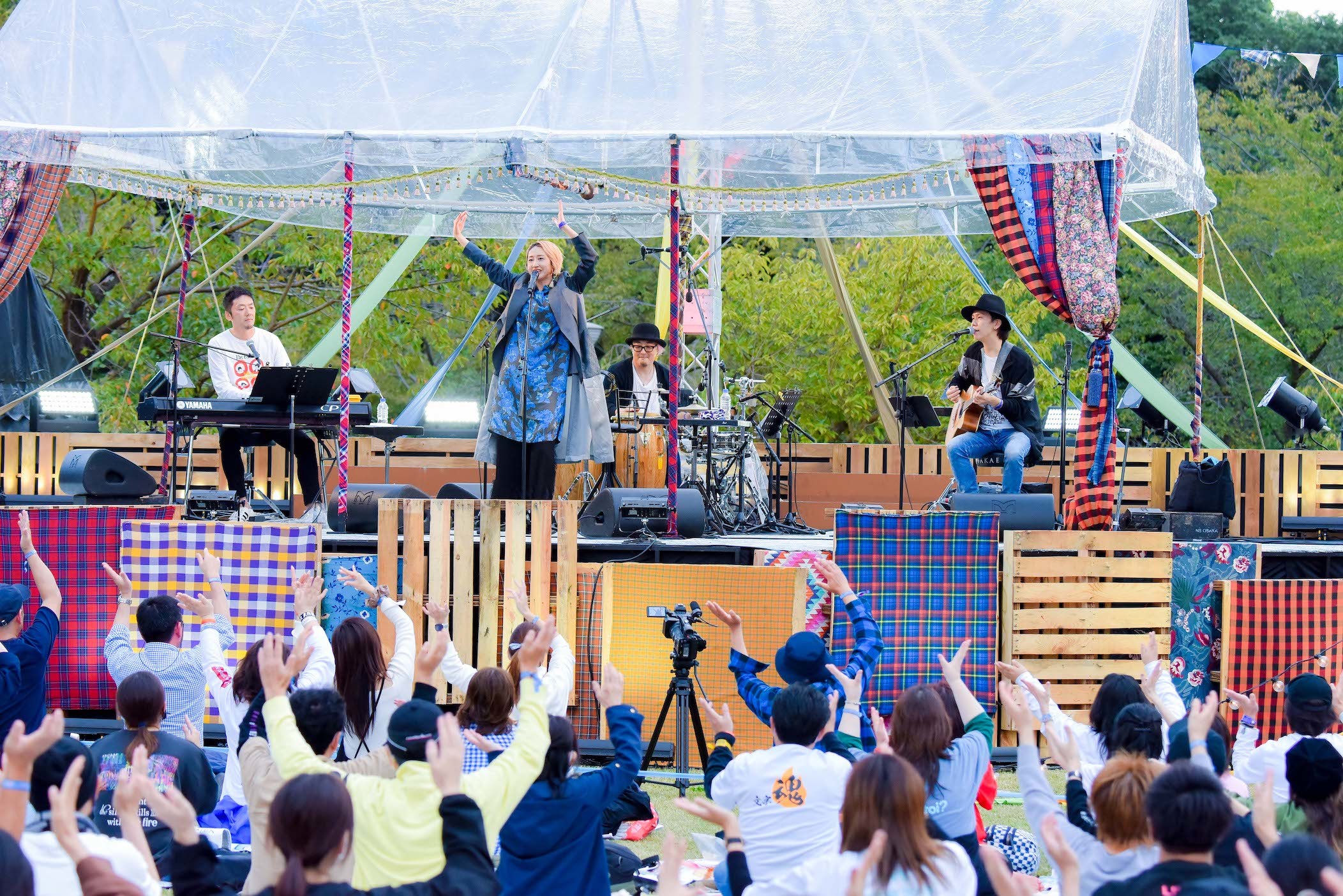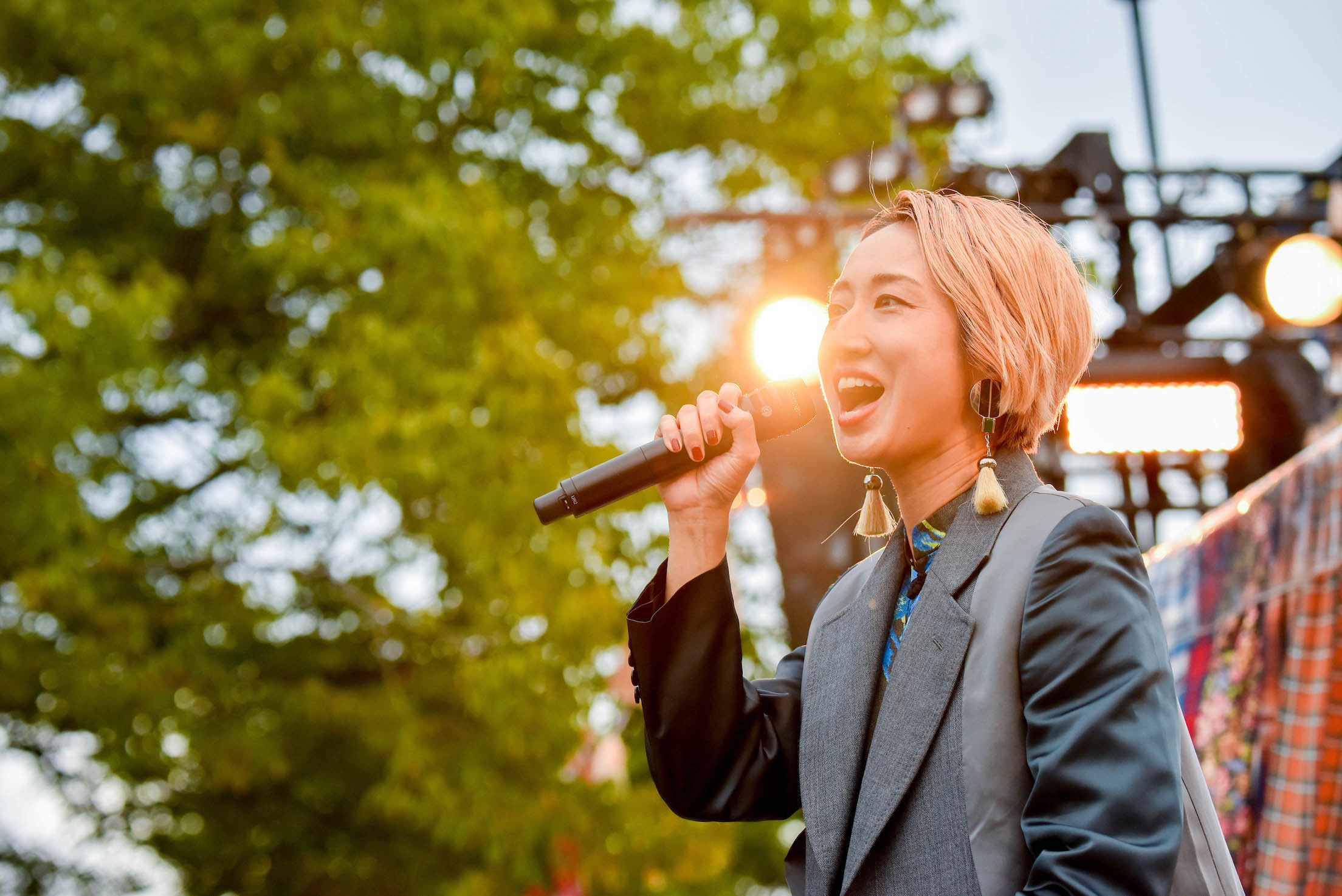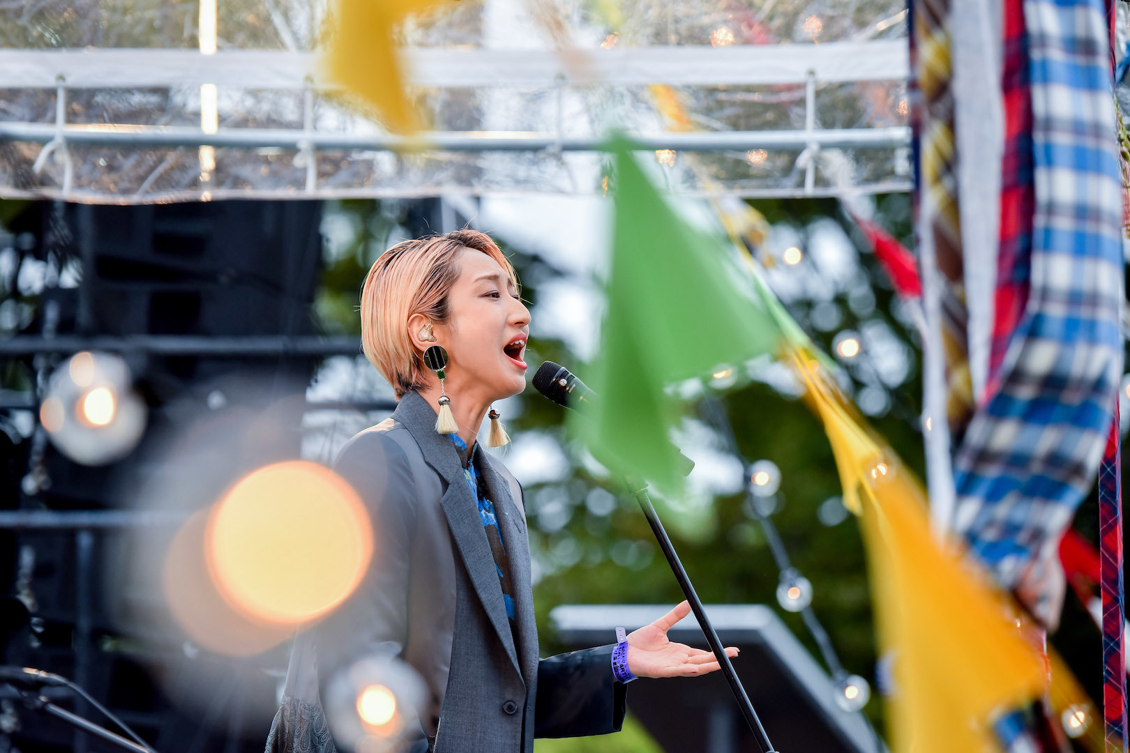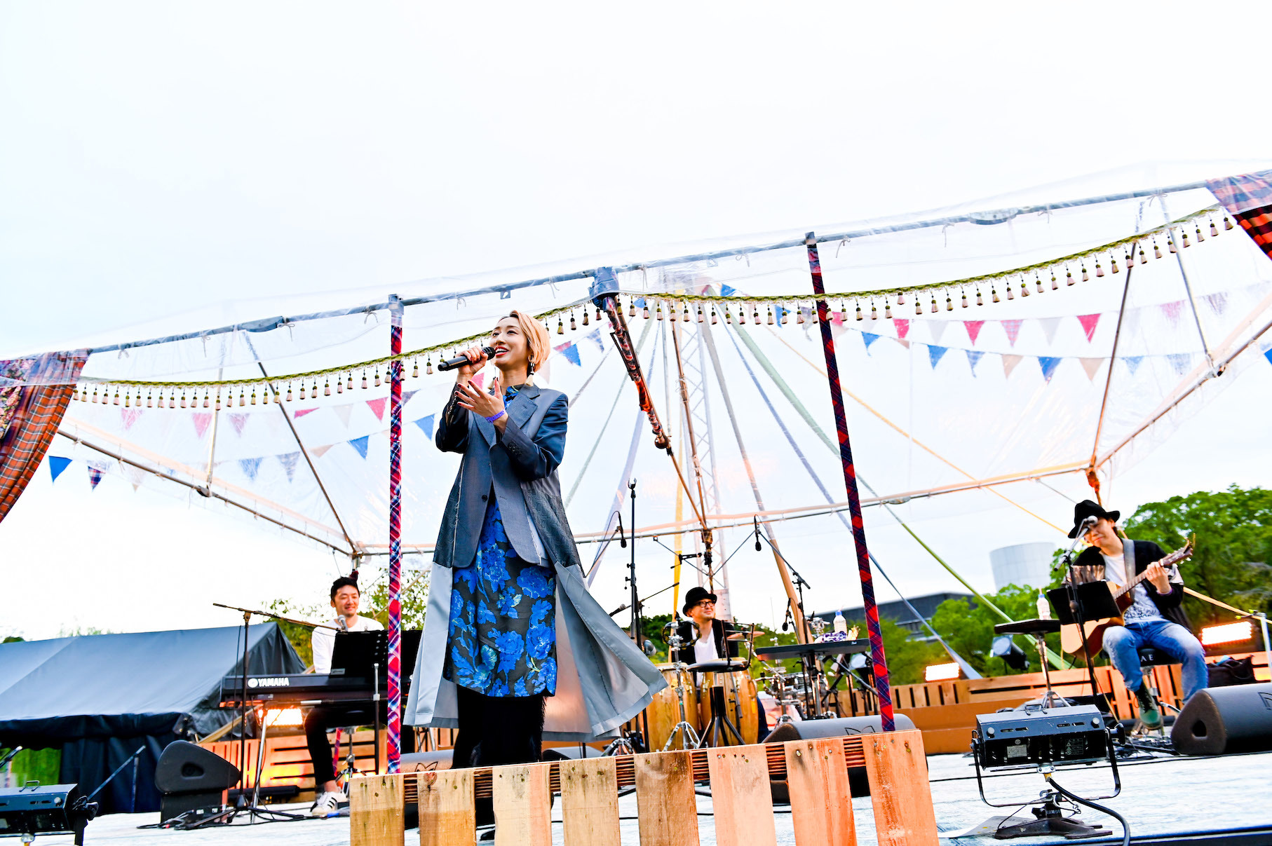 そのまま、2曲目「Heroes」へ。強い風が吹くなか、<冷たい雨は 降り止まず 吹き続ける風 身を削る>という歌詞は、より伝わってくるし、<追いかける 夢はきっと この道照らす 光>と壮大に歌われる。カバー曲も多く歌う彼女だが、この日もオリジナル2曲続けてからカバー曲を歌うという緩急の付け方は流石だった。「少し懐かしいのいきましょ!」と声掛けをしてから、8月26日に発売された最新カバーアルバムから、「異邦人」を。あの独特なメロディーがギタリストによって爪弾かれ、そこに鍵盤とパーカッションが重なり、彼女が歌い上げる。同アルバムに収録される八神純子の「想い出のスクリーン」と2曲続けて、懐かしの昭和歌謡曲を聴く事が出来た。