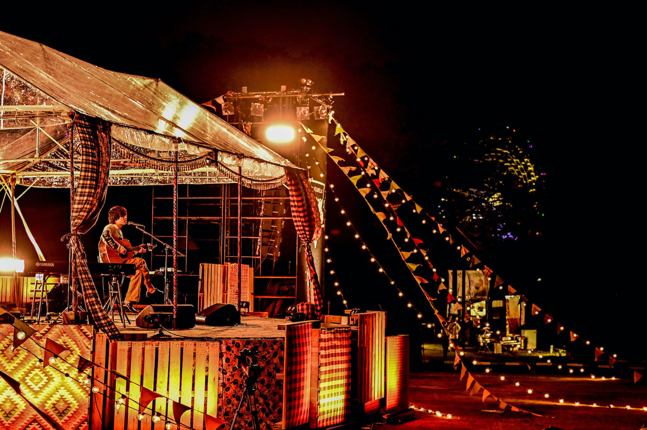 「Chillin‘ Vibes STAGE」初日。緑に囲まれ、装飾が施された大きな木があり、芝生があり、後方にはオープンソファー席(有料時間貸し)もある理想的なコンパクトステージ。ステージは木材を重ね合わせた作りになっており、温もりを感じる。