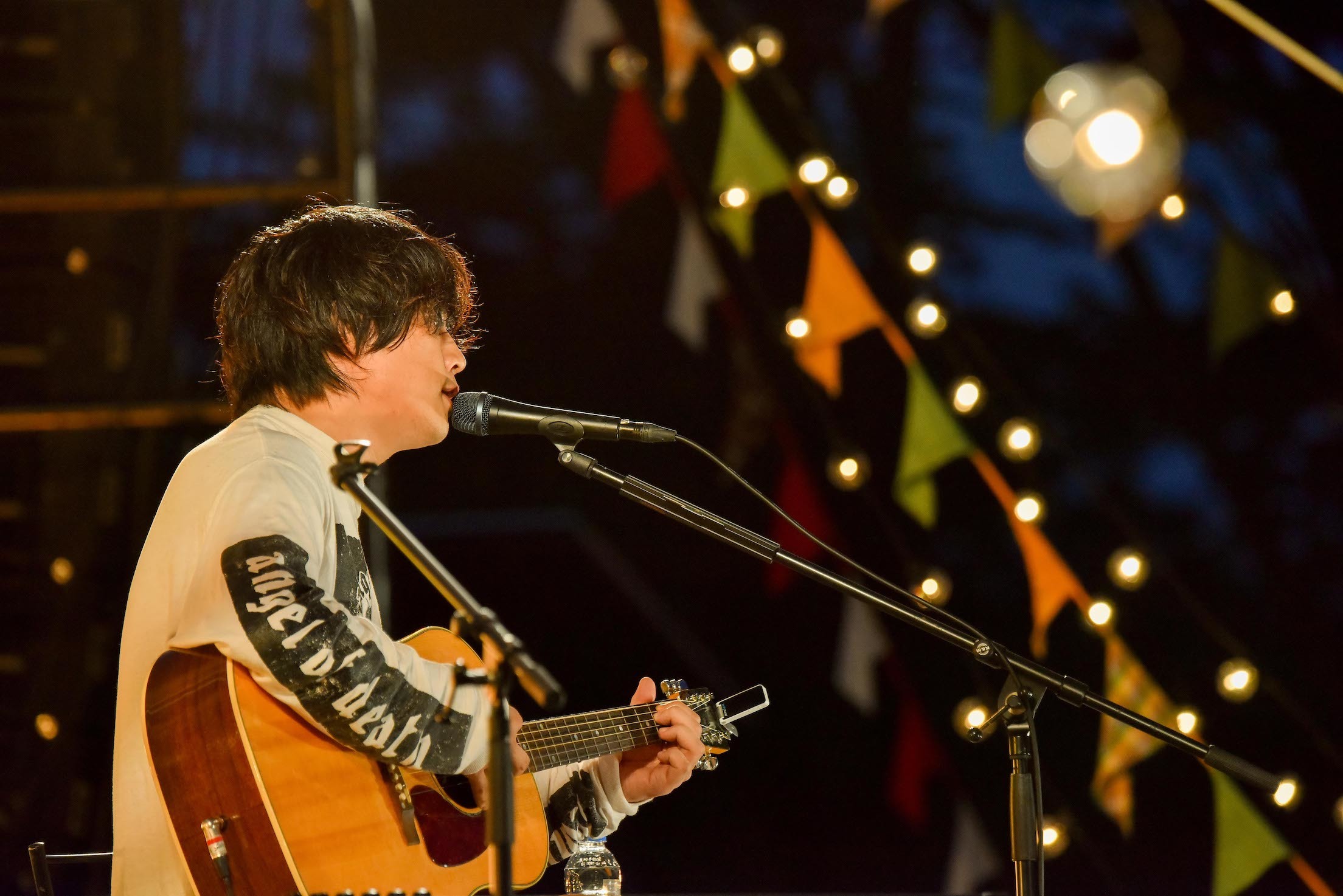 日も暮れてきて、照明も綺麗に映える17時40分、FM802弾き語り部部長でもあるLAMP IN TERRENの松本大が登場。我々ライターが貰うセットリストにも「セットリストはステージ上で決まり」と書いてあったが、まさかの「およげ!たいやきくん」のカバーからスタート。45年前に子供向けとして発表された楽曲だが、情感たっぷりに歌い上げられると、まるで野太いブルースにしか聴こえない。歌い終わり、「「およげ!たいやきくん」改め、「およげ!たいやきさん」でした!」と紹介される。大人っぽいから、「さん」が付いたのかななど色々と想像しながら楽しめたし、ライター目線としては何が歌われるか決まってないのはドキドキものだが、観客目線としては何が歌われるか決まってないのはワクワクでしかない。