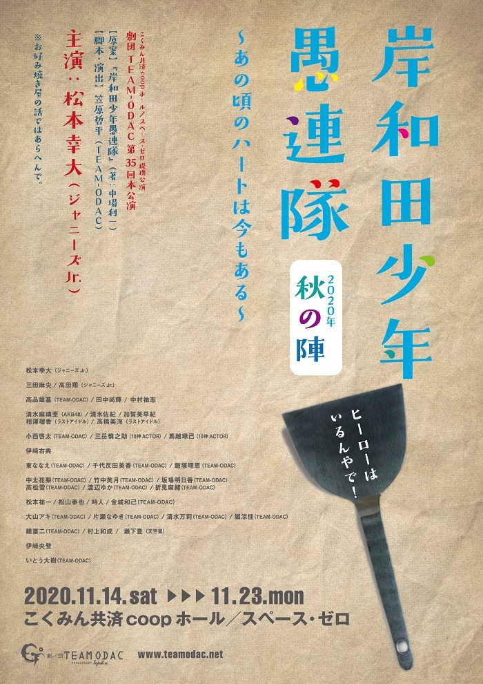 2020年11月14日(土)〜11月23日(月)こくみん共済 coop ホール/スペース・ゼロにて、劇団TEAM-ODAC第35回本公演『岸和田少年愚連隊〜あの頃のハートは今もある〜(2020年 秋の陣)』が上演されることが決定した。