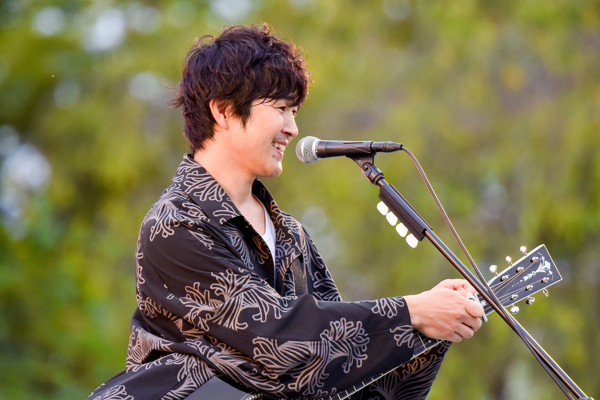 「大阪に元気と初雪も届けたい。まだ少し暑いけど、季節を感じてもらえたら」と披露したのは「粉雪」。レミオロメンの名曲の披露に、フィールドからは大きな拍手が沸き起こる。バンド時代に大切にしてきた楽曲をソロでも聴ける嬉しさはもちろん、アコースティック版にアレンジしての演奏は貴重!夕暮れを迎え、少しひんやりとしてきた会場に美しいファルセットが響き渡る。サビ部分の遠く伸びていく歌声を聴きつけ、会場に走って駆け寄る観客もいる。次曲「マスターキー」では丸みを帯びた歌声にほんの少し甘さを足し、至福の時間を積み上げていく。