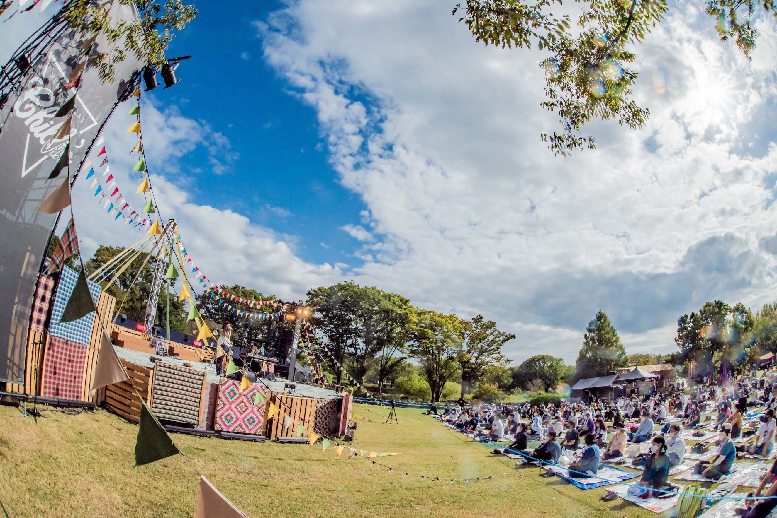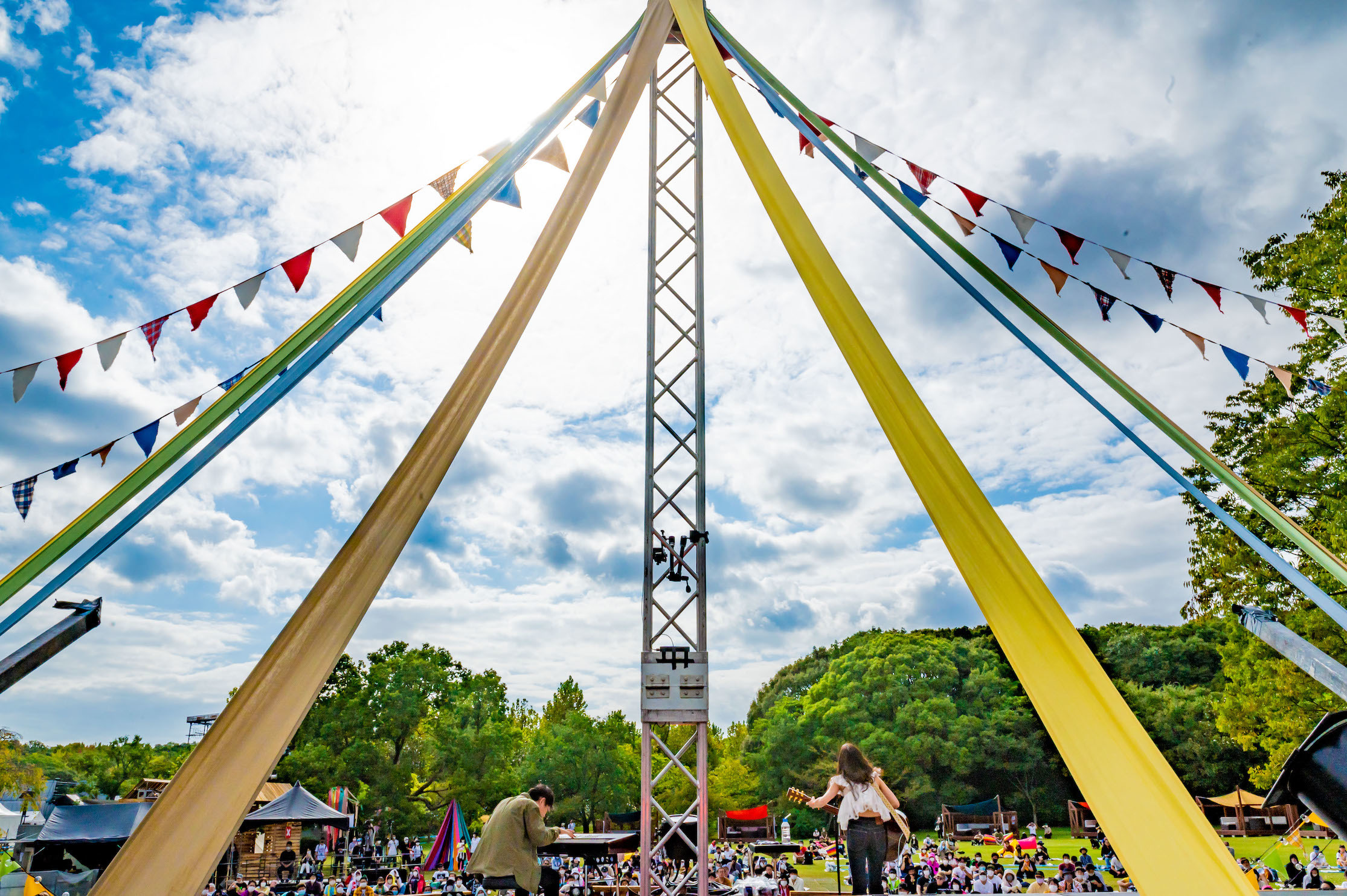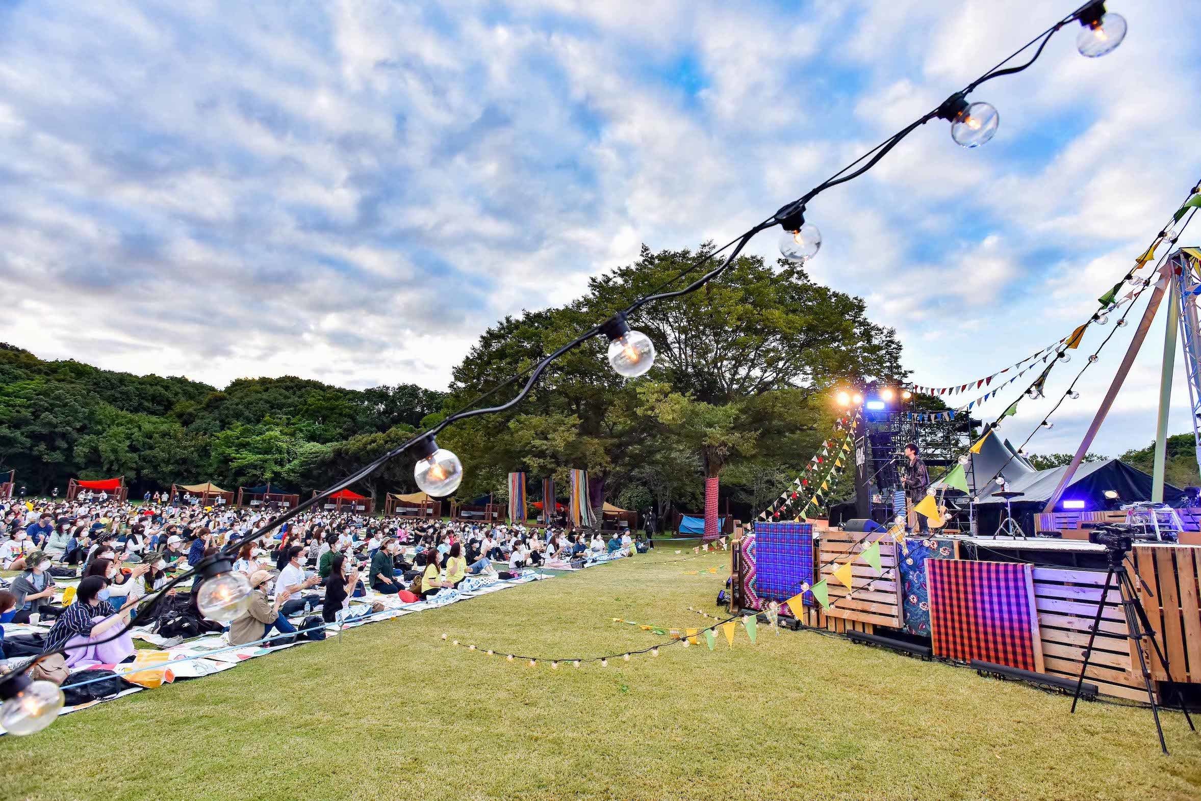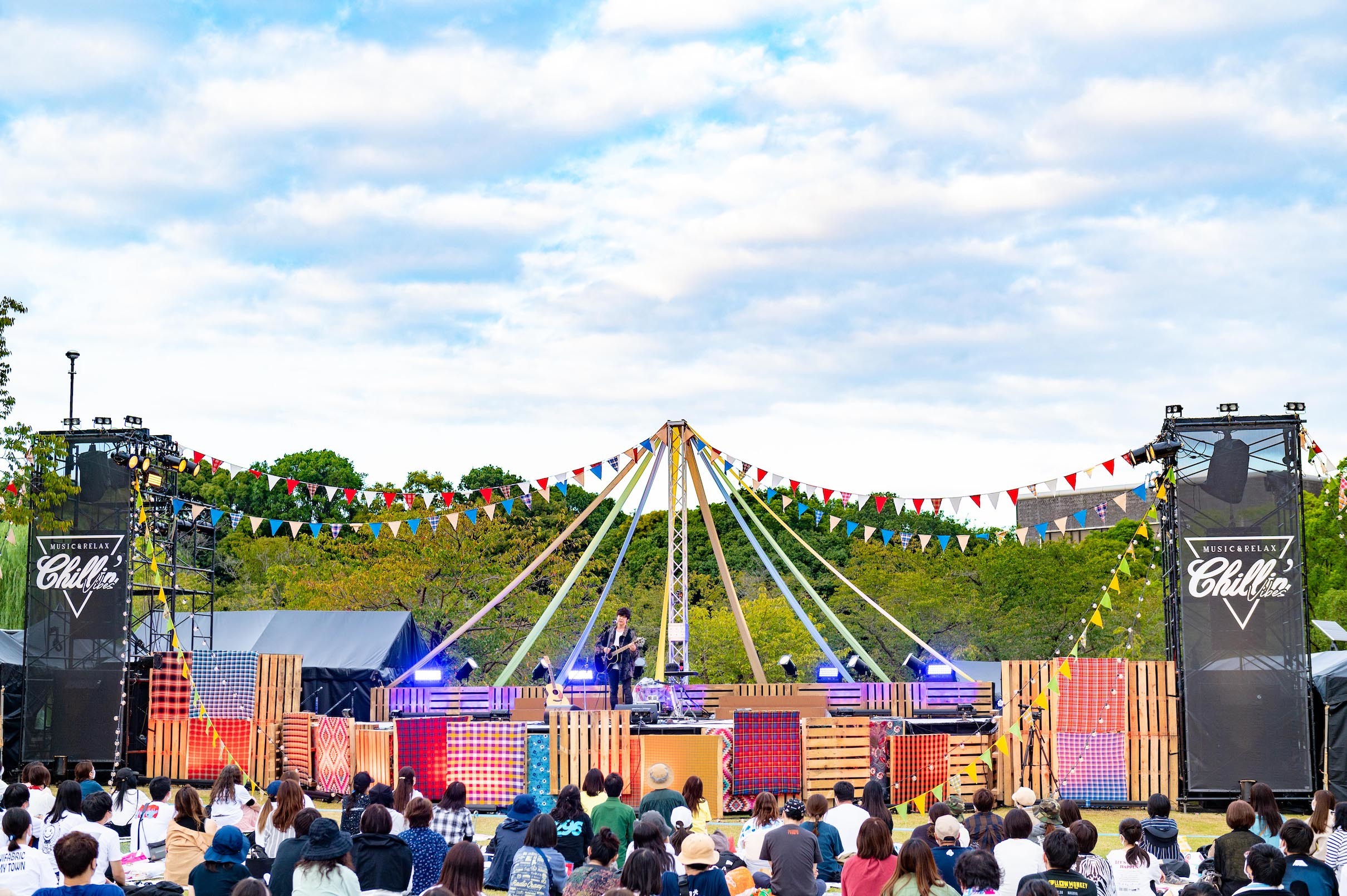 『OSAKA GENKi PARK』2日目は前日よりも気候が良く、秋晴れの過ごしやすいお天気に。木々に囲まれたChillin’ Vibes STAGEも一層過ごしやすくなり、会場周辺には前日にはなかったエアーソファやカラフルなタープが会場を彩り、「Chill」にぴったりな空間に。5つあるステージの中でもスタート時間が最も遅いこともあって、ライブを待ちつつ芝生の上でのんびりとした時間を過ごす観客も多い。
