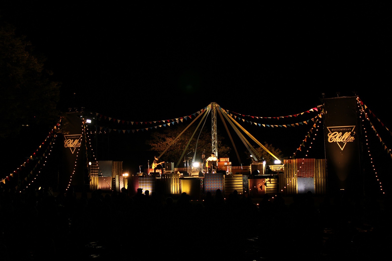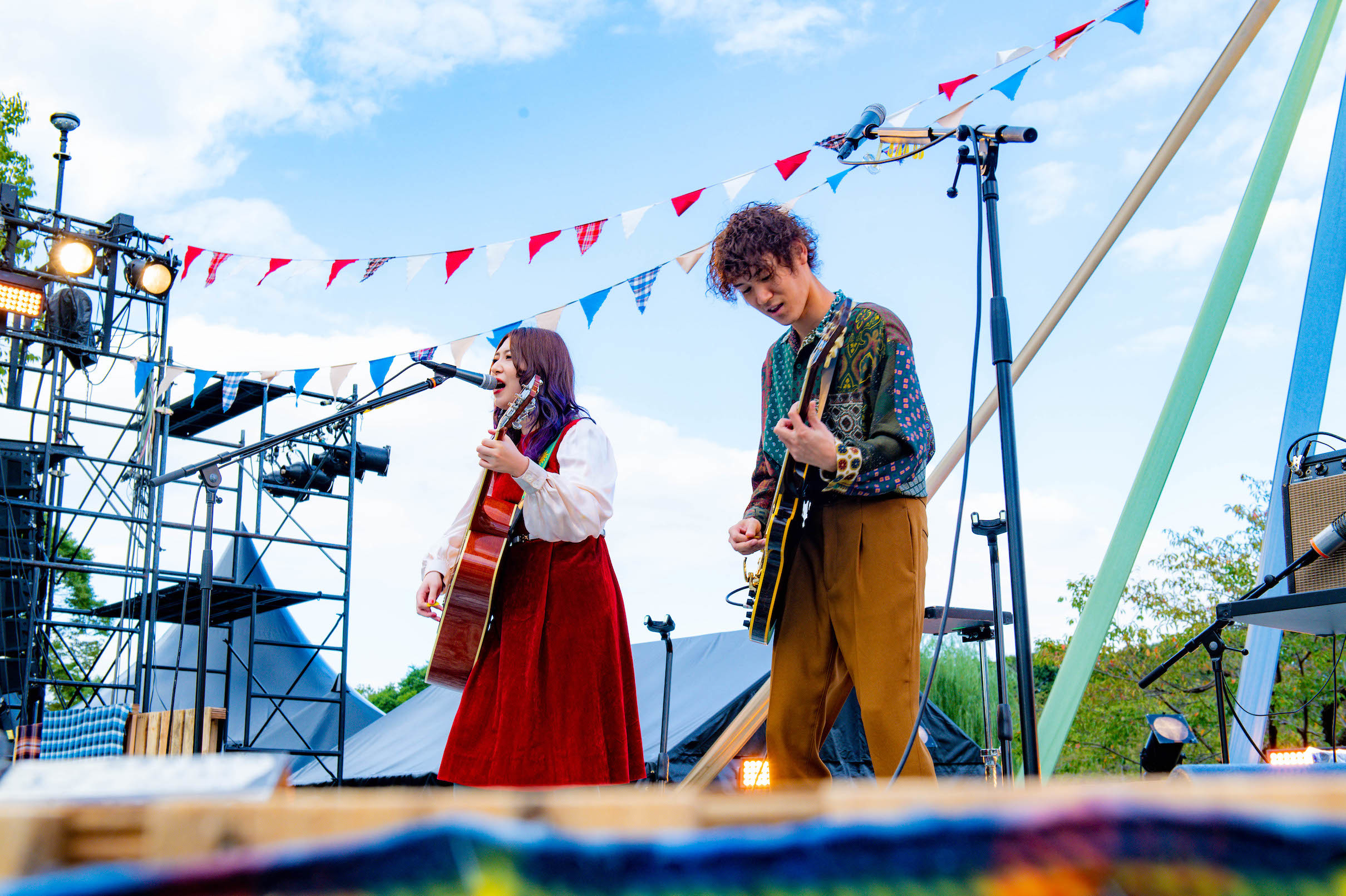 先日リリースしたばかりの新曲「東京は燃えてる」。歌詞にある東京という言葉をそれぞれが思う場所に当てはめて聴いてもらえたらと、アコギ1本と歌声で歌い上げる。待ちに待った新曲披露とはいえ、デュオでのアコースティックライブはやはり貴重だ。「幸せだな……」と、久しぶりの観客の前でのライブに思わず言葉を漏らし、自粛期間中にそれぞれの自宅で録音して楽曲を完成させたという「こんな夜更けは」へ。時代を切り取った、夜を思わせるスモーキーなサウンドは音を遮るもののない、野外の「Chill」な会場で聴くのも気持ちが良い。