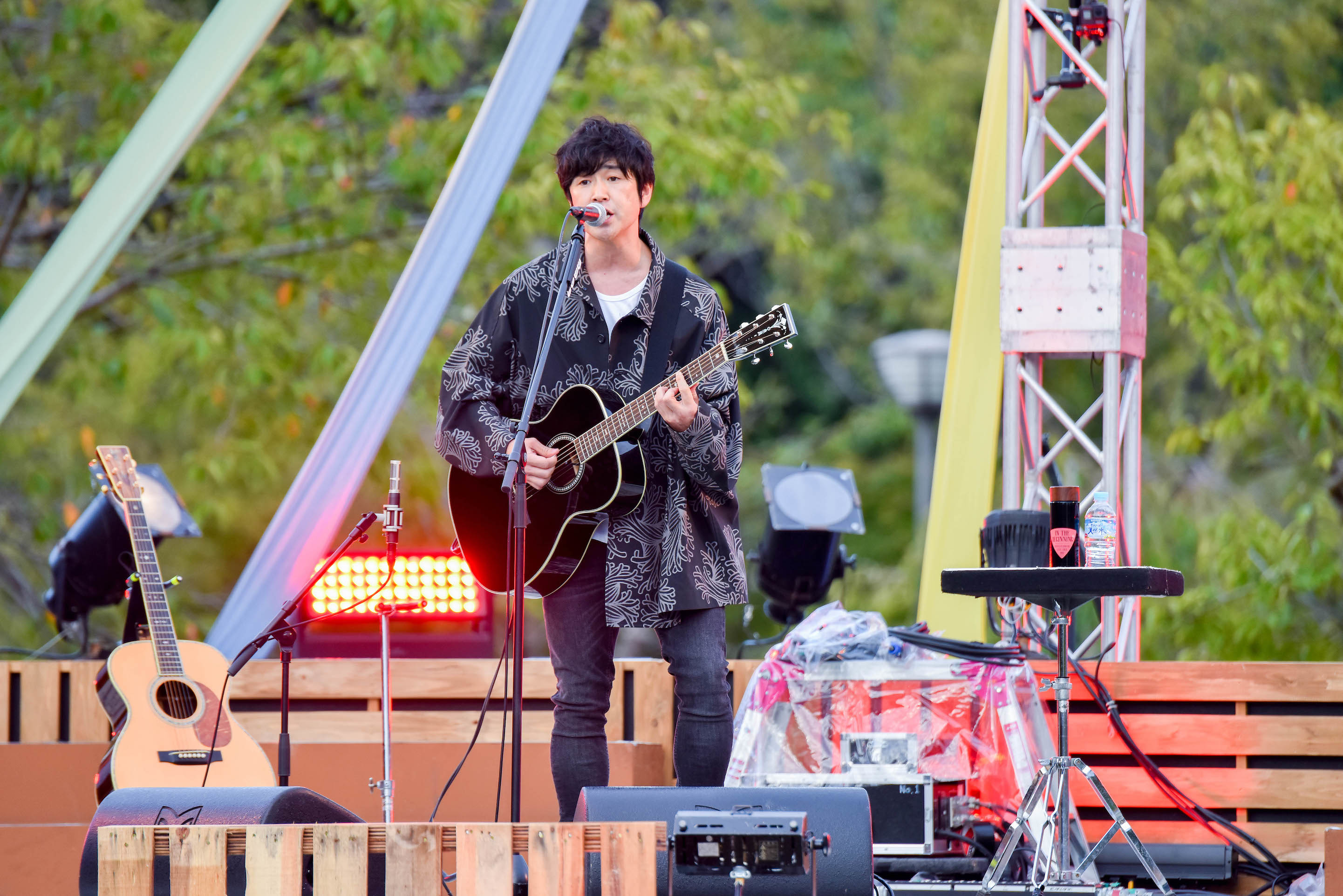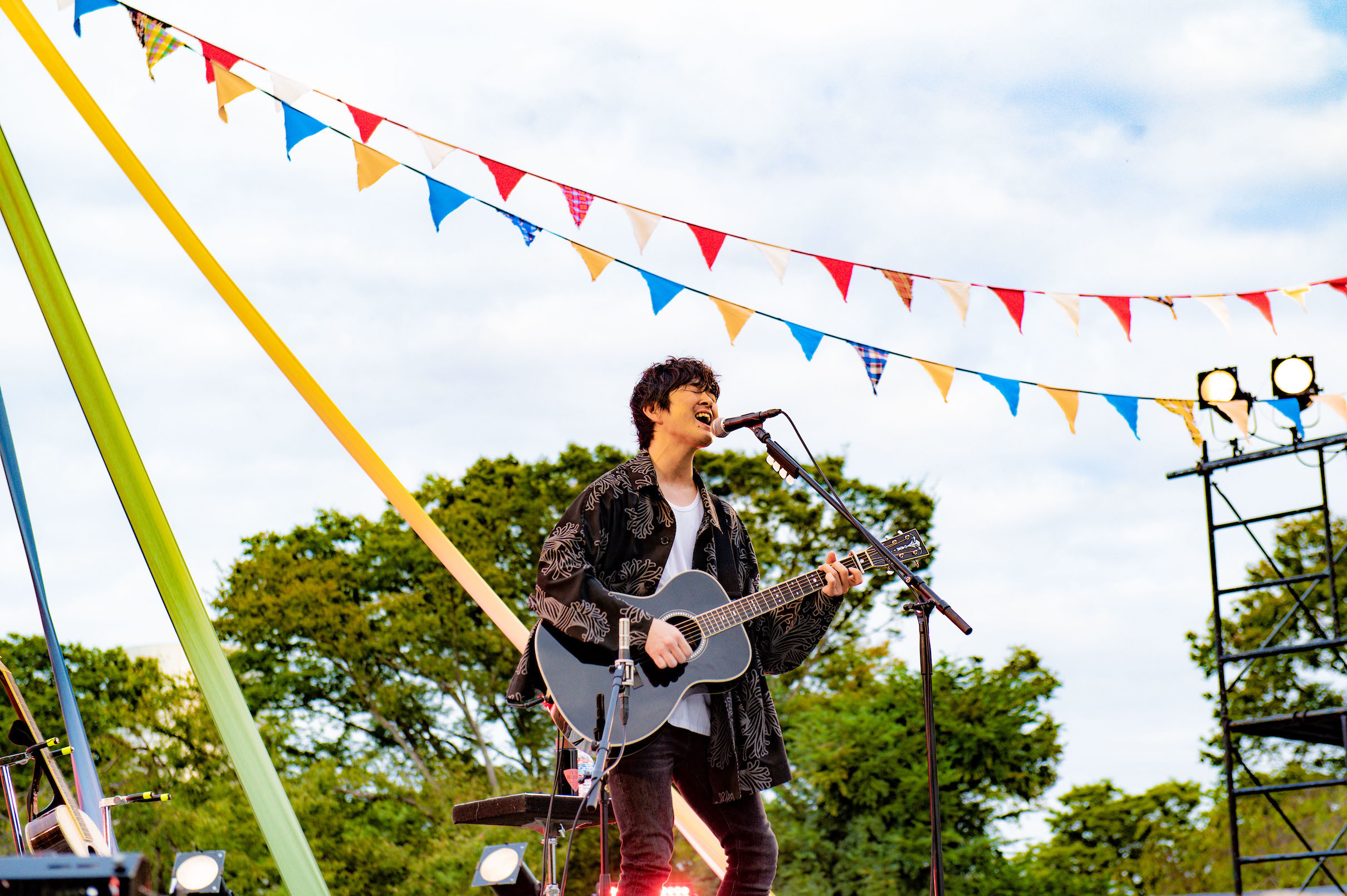 新旧様々な楽曲で会場を盛り上げたのは藤巻亮太。まずは1曲目「五月雨」。アコースティックギターと足元でリズムを鳴らすストンプボックスで軽快に音を鳴らし、柔らかくも力強い歌声で歌い上げていく。会場後方では芝生の上を裸足で踊る小さな子供もいて、ステージの「ミュージック&リラックス」のテーマにぴったりハマっている。心配していた天気も嘘みたく晴れ、待ちに待った有観客のライブに「日頃の行いが良かったのかな」とご機嫌に冗談も飛ばしていく。