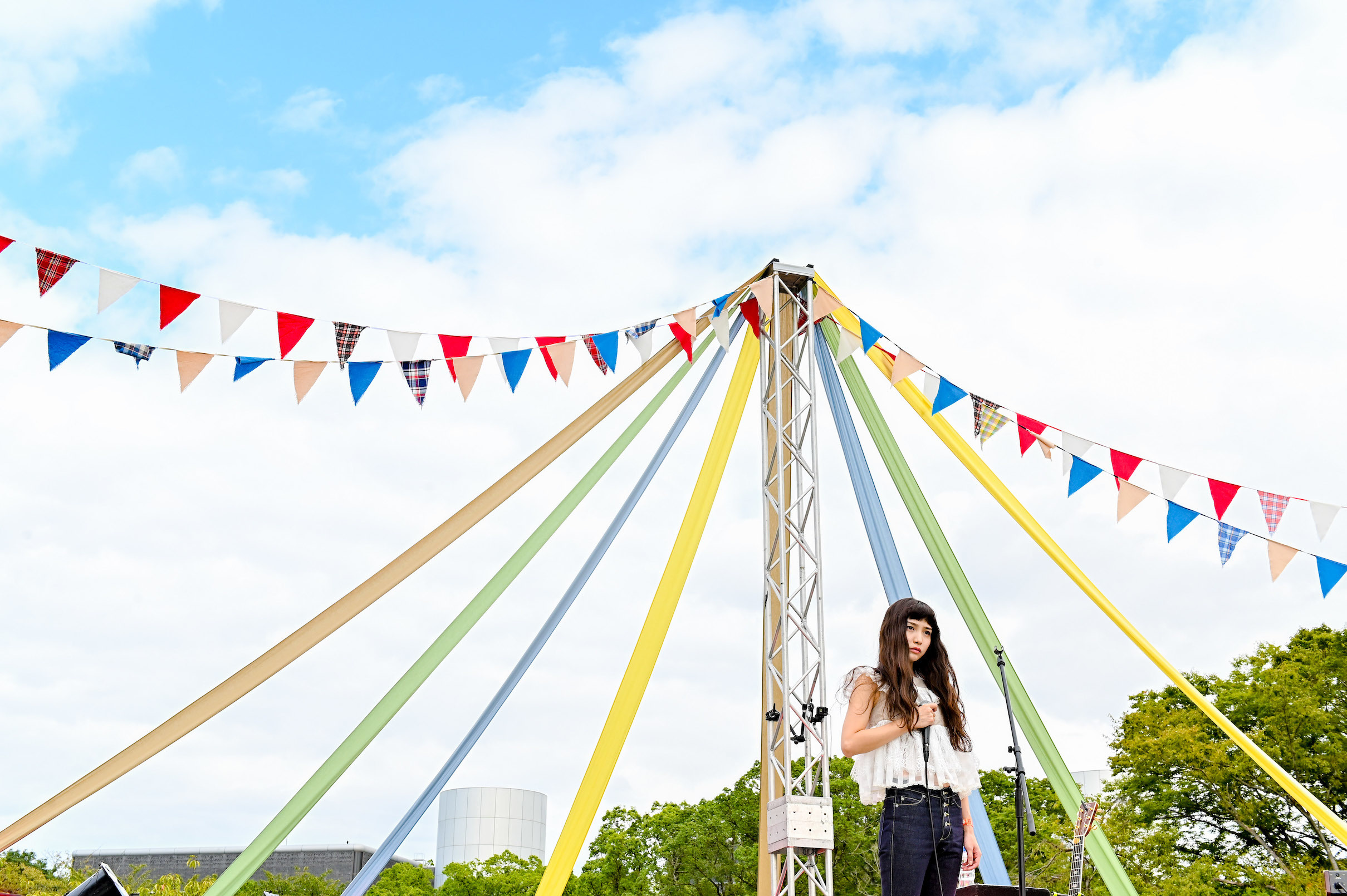 次曲「Stranger」、漏れる吐息にもしっかりと色を感じる歌声を聴かせたかと思えば、「せーーの!!」と声をかけてギターをかき鳴らすと、途端に歌声はエネルギッシュになる。声の表情の豊かさに夢中になって聴き入っていると、「FRIDAY」でさらにアグレッシブさを増していく。華奢な姿からは想像できない変幻自在な歌声に驚く人も多く、会場に入った途端に足をとめて魅入る人の姿も。MCになると、またまた驚きが。「楽しい思い出が作れなかった夏なので、キラキラとした思い出を作りたい」と、久しぶりの観客の前でのライブに意気込みを語るも、その声はものすっごくキュートで、カラコロとした表情もまた魅力的だ。